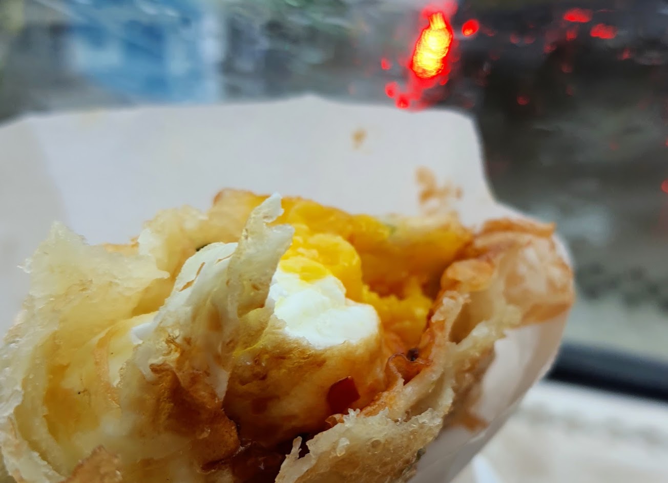 好吃? 蔥油餅加蛋加起司超讚 要小心蛋汁流出來 …