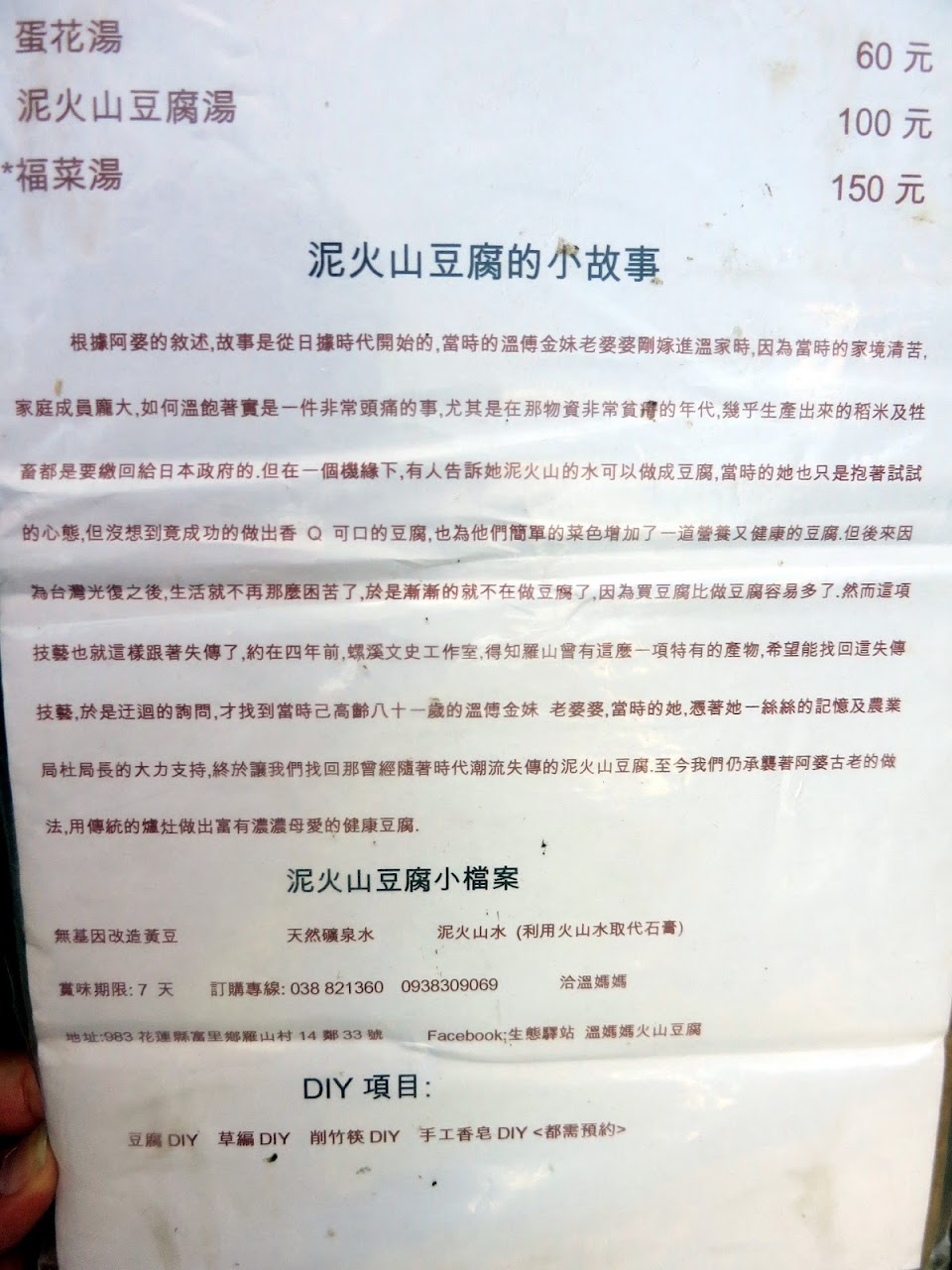 非常有意思的一個村莊。第一次知道火山豆腐是曾於電視上看過一個專題報導,當時對於使用火山泥水為媒介,耗費心力而成的豆腐有著好奇。