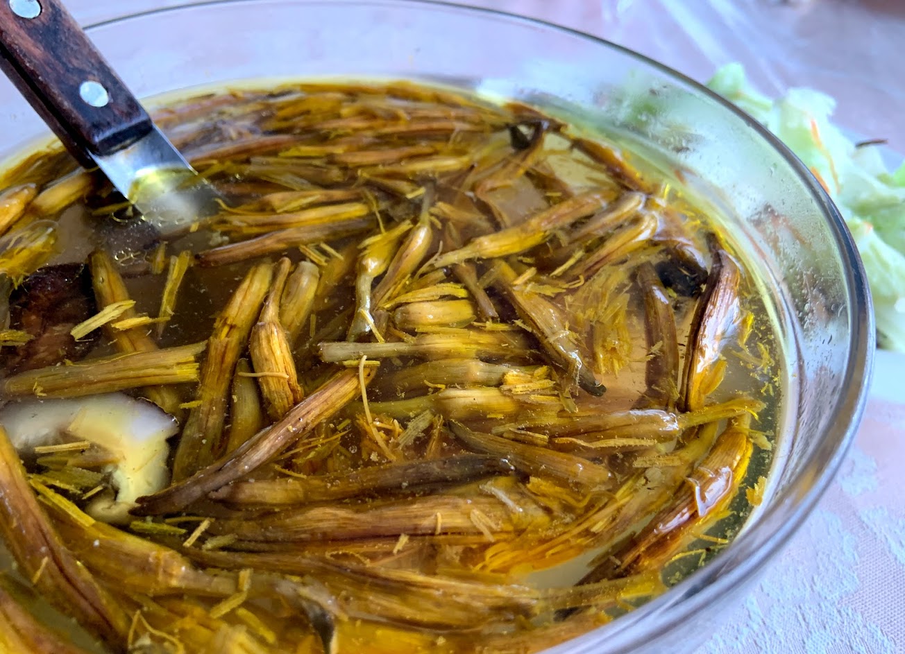 餐點中我們最期待金針花雞湯,由於只想著加緊趕快把菜吃完,渡過前面蒼蠅的問題,最後要喝「金針花雞湯」時,發現湯上面有一些蟲的屍體浮在湯上面(我們大家都覺得是因為金針花的處理過程有問題),這就算了…最後是我生平第一次看到雞湯裡面的雞肉竟然只有「雞爪、雞腳、雞頭跟1小塊雞翅膀的中段」!