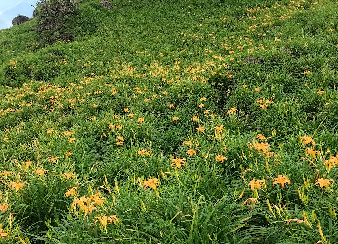 這片優美的山間地帶鋪滿橙色的萱草,當地人將這種植物稱為「金針花」。