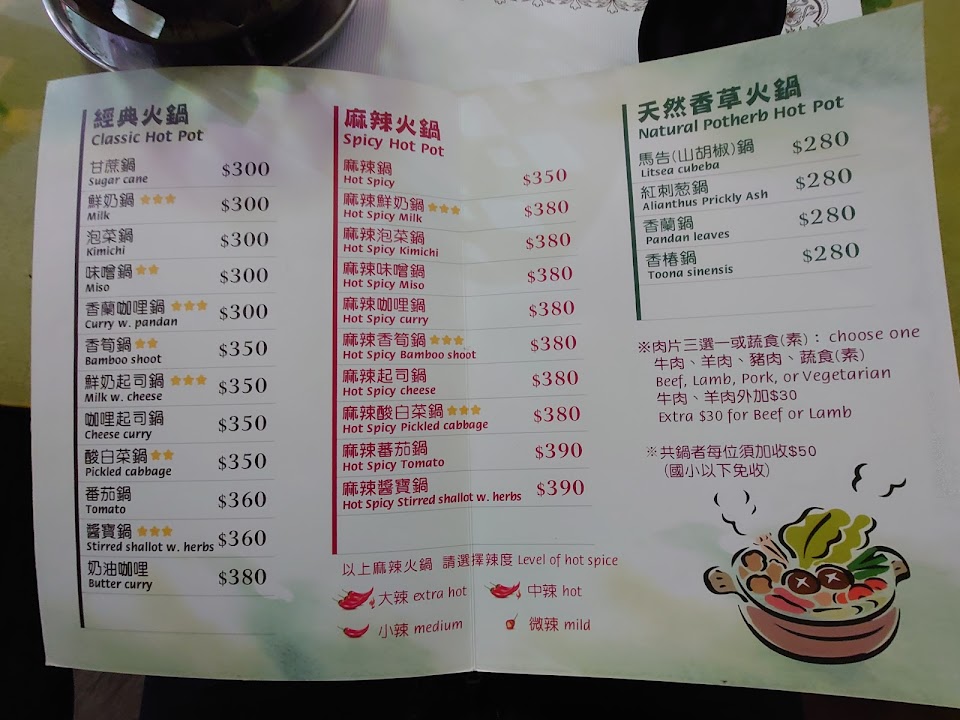 火鍋有許多品項可供選擇,當天選擇番茄鍋、麻辣香筍鍋。番茄鍋味道濃郁不酸、平易近人,麻辣香筍有特色,香筍有點類似罐頭裡的香辣筍絲,如果能換成綠竹筍或麻竹筍的筍片也許更好,兩種鍋物附贈的菜盤都一樣,有非常多的野菜(當天是木鱉子、野莧菜),木鱉子是第一次嘗試,相當驚豔。白飯、王子麵、冬粉都是自取、免費供應。