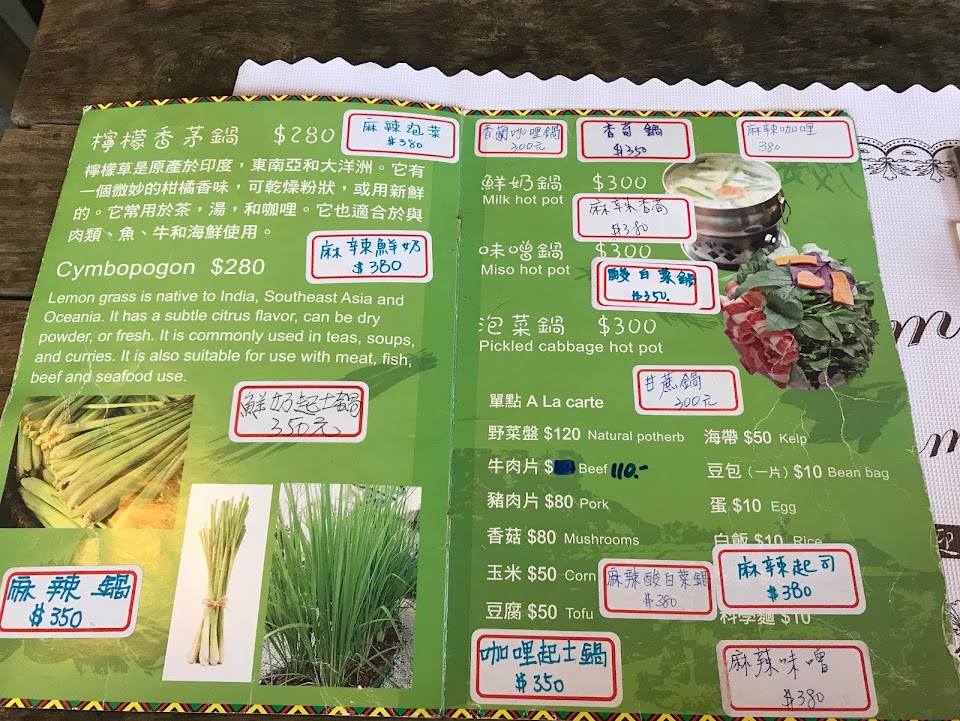 火鍋有許多品項可供選擇,當天選擇番茄鍋、麻辣香筍鍋。番茄鍋味道濃郁不酸、平易近人,麻辣香筍有特色,香筍有點類似罐頭裡的香辣筍絲,如果能換成綠竹筍或麻竹筍的筍片也許更好,兩種鍋物附贈的菜盤都一樣,有非常多的野菜(當天是木鱉子、野莧菜),木鱉子是第一次嘗試,相當驚豔。白飯、王子麵、冬粉都是自取、免費供應。