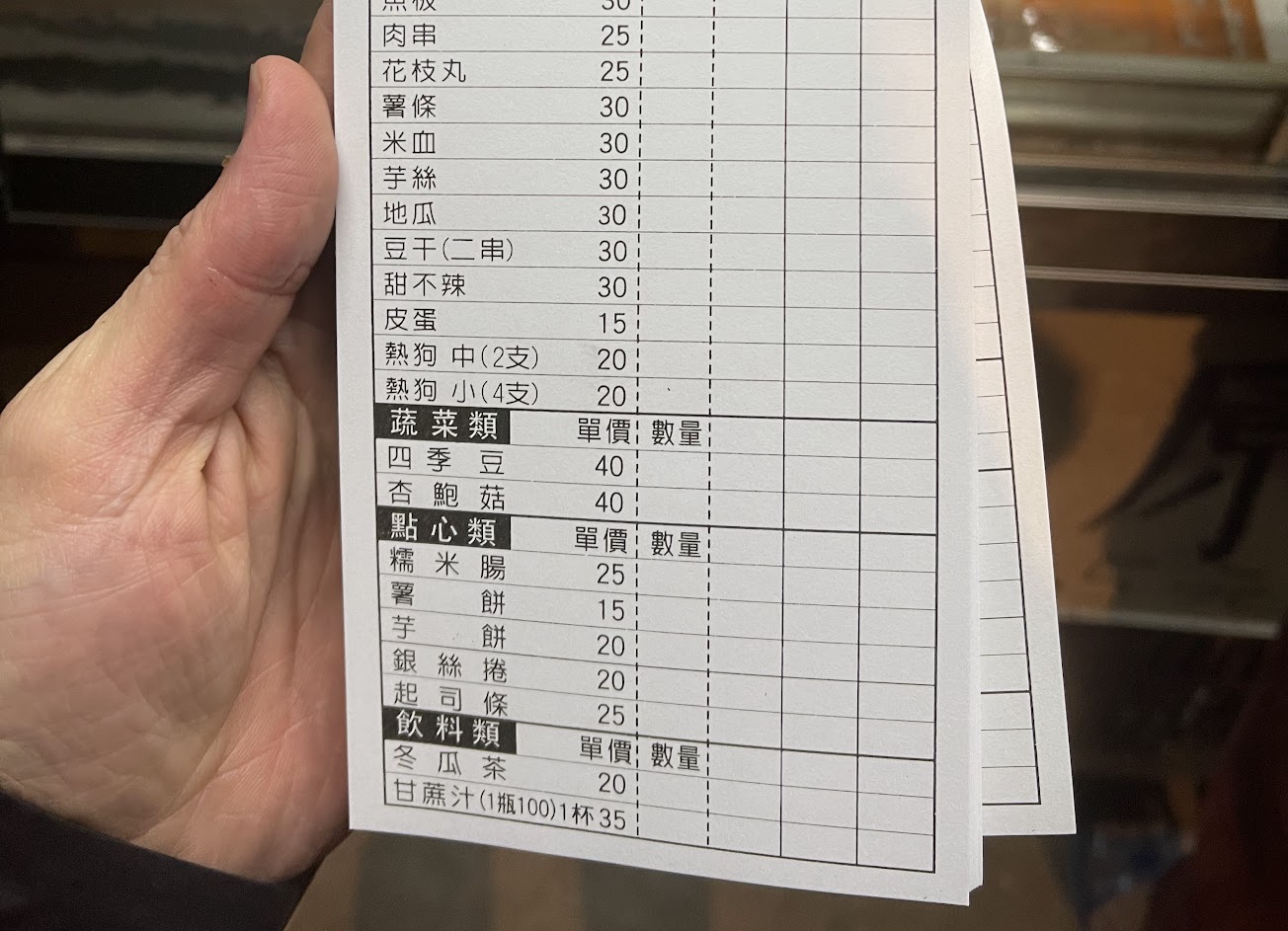 很棒的地方,有濃郁的當地氛圍。有了谷歌翻譯,點餐並不那麼困難(你必須用相機翻譯菜單,然後選擇食物,寫下辣度的數量和級別)。準備時間大約需要 15 分鐘(只能外賣,裡面沒有座位),所以至少我有時間從附近的便利店買了幾瓶啤酒。我點了薯條、青豆皮蛋、炸雞排、炸雞腿、炸串雞心(總共215新台幣,都是辣度最高的。一切都很好,雖然我不會再點雞腿了,我不太喜歡挑骨頭。絕對推薦給那些想要體驗當地餐飲風格並了解如何在這裡點餐/如何使用相機谷歌翻譯的人,因為店主不會說英語。