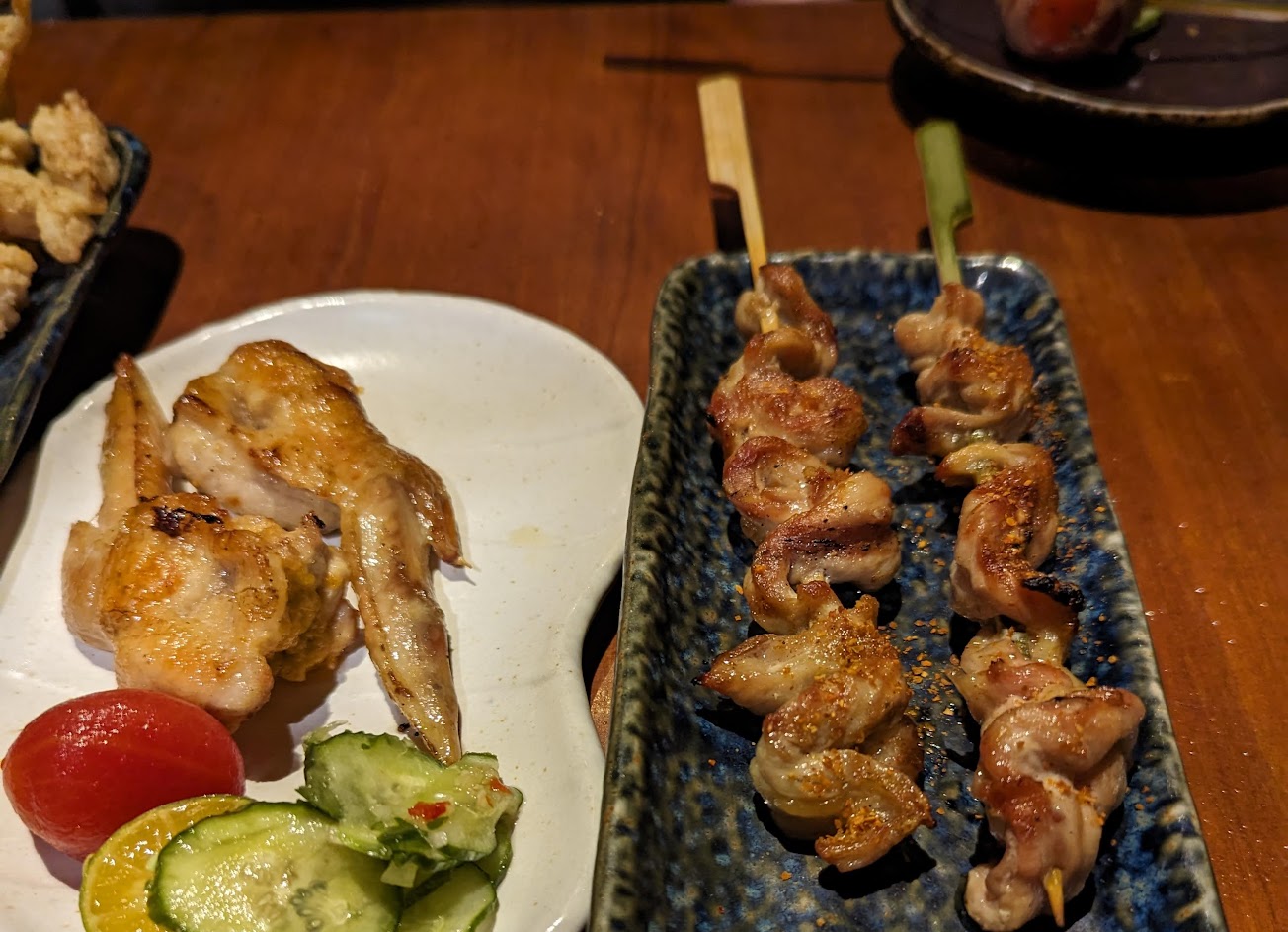 當天最好吃的是剝皮辣椒雞湯,梅子番茄也好吃,其餘吃了滿多串燒,都非常油、濕濕的,就算是鹽烤雞松阪,通常在其它地方吃是烤的表面焦香的料理,也是整串濕濕油油,更別說是手羽先、碳烤中卷、椒鹽雞軟骨,全部都濕濕油油,本店的雞軟骨帶著非常多的肉,很像雞肉串。