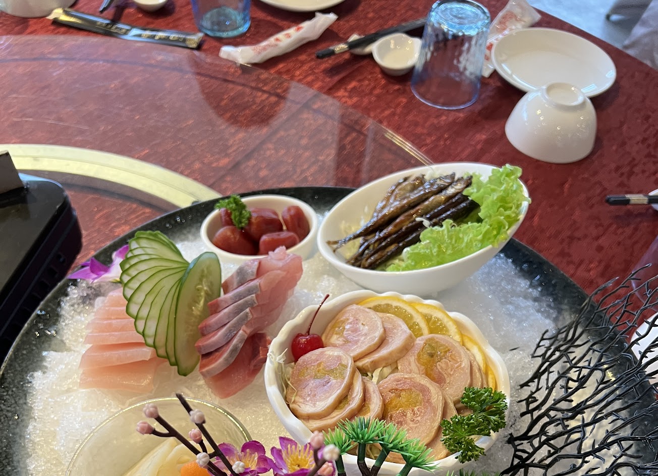 刺身盤、蘋香干貝、蝦蛄牛奶鍋、海鮮粥蟹肉、清蒸龍蝦、炭烤羊小排、炭烤圓鱈、三星蔥餅、四季水果、甜點