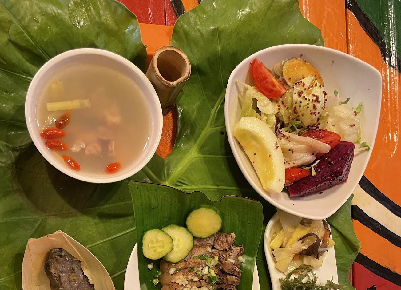 不論是香蕉飯、竹筒飯、炒山豬肉、鹹豬肉、湯品、馬告調味的各式小菜⋯沒有一道令人失望!