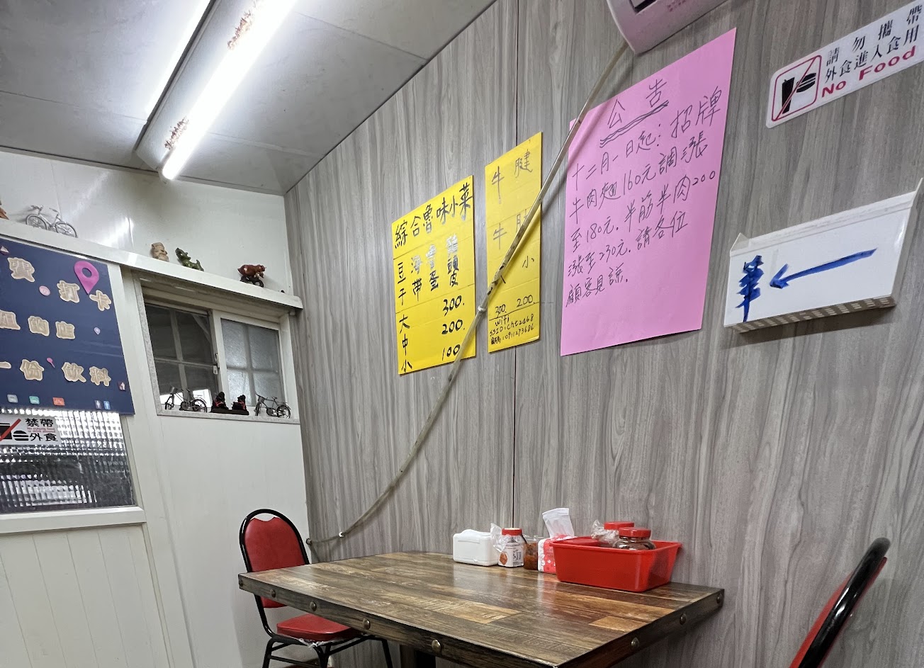 環境簡單乾淨,牛肉麵超級好吃,平地吃不到。牛肉麵上面的辣椒,麻而不辣,半筋半肉牛肉麵一碗230元,肉超多,高麗菜好吃份量多,很超值。