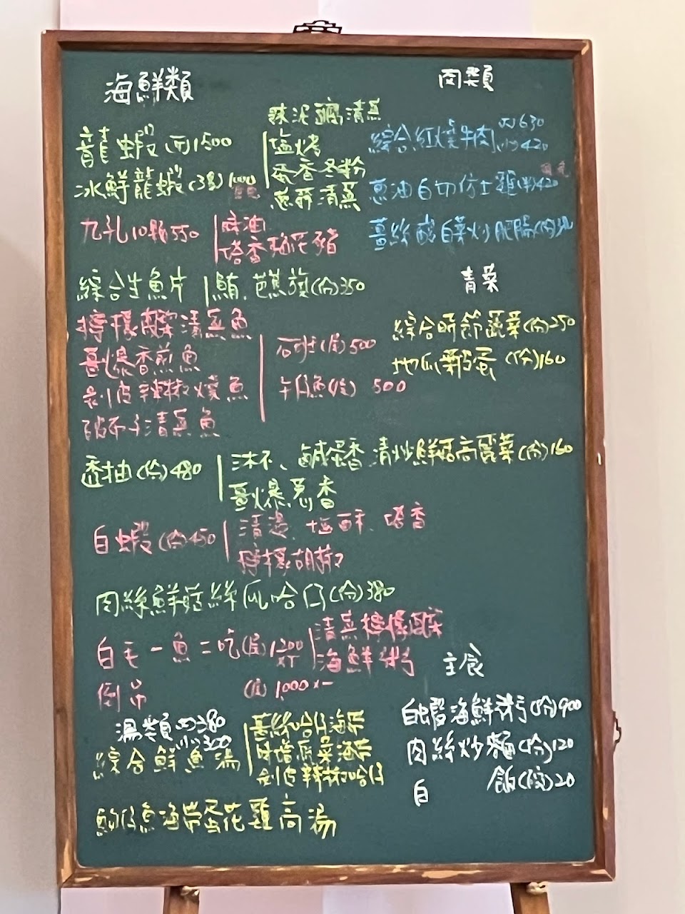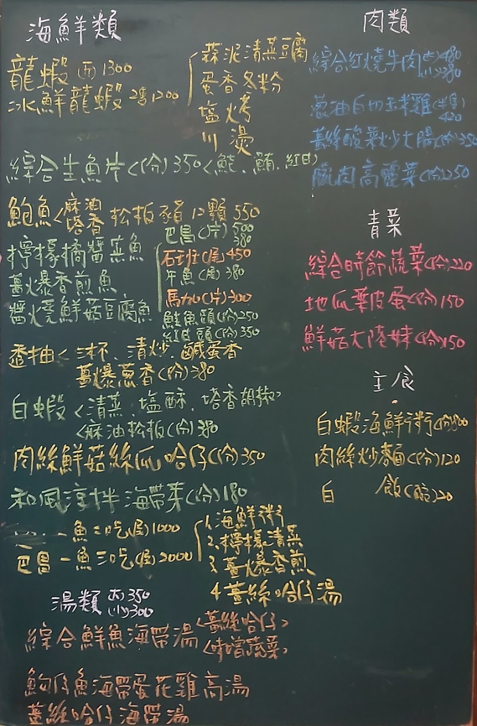 這家店料理水準很高,想吃海鮮,如龍蝦、透抽,有各種料理方式選擇,而且價目也非常清楚標示在黑板上。