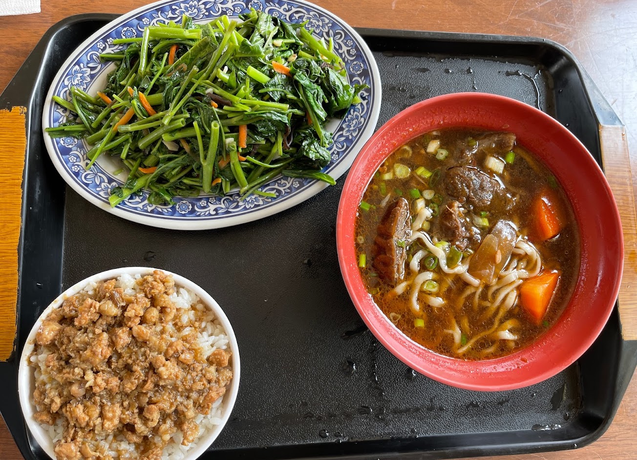 牛肉麵的麵條是細條拉麵,口感還不錯有嚼勁 湯頭屬於紅燒味但帶著甘甜也是好喝, 可以看到洋蔥跟紅蘿蔔的蔬菜, 牛肉的口感不錯也大塊,數起來應該是五塊, 滷肉飯是瘦肉的,份量大碗能吃飽 炒青菜的空心菜脆,還有加上木耳跟紅蘿蔔, 是吃起來有豐富的均衡營養