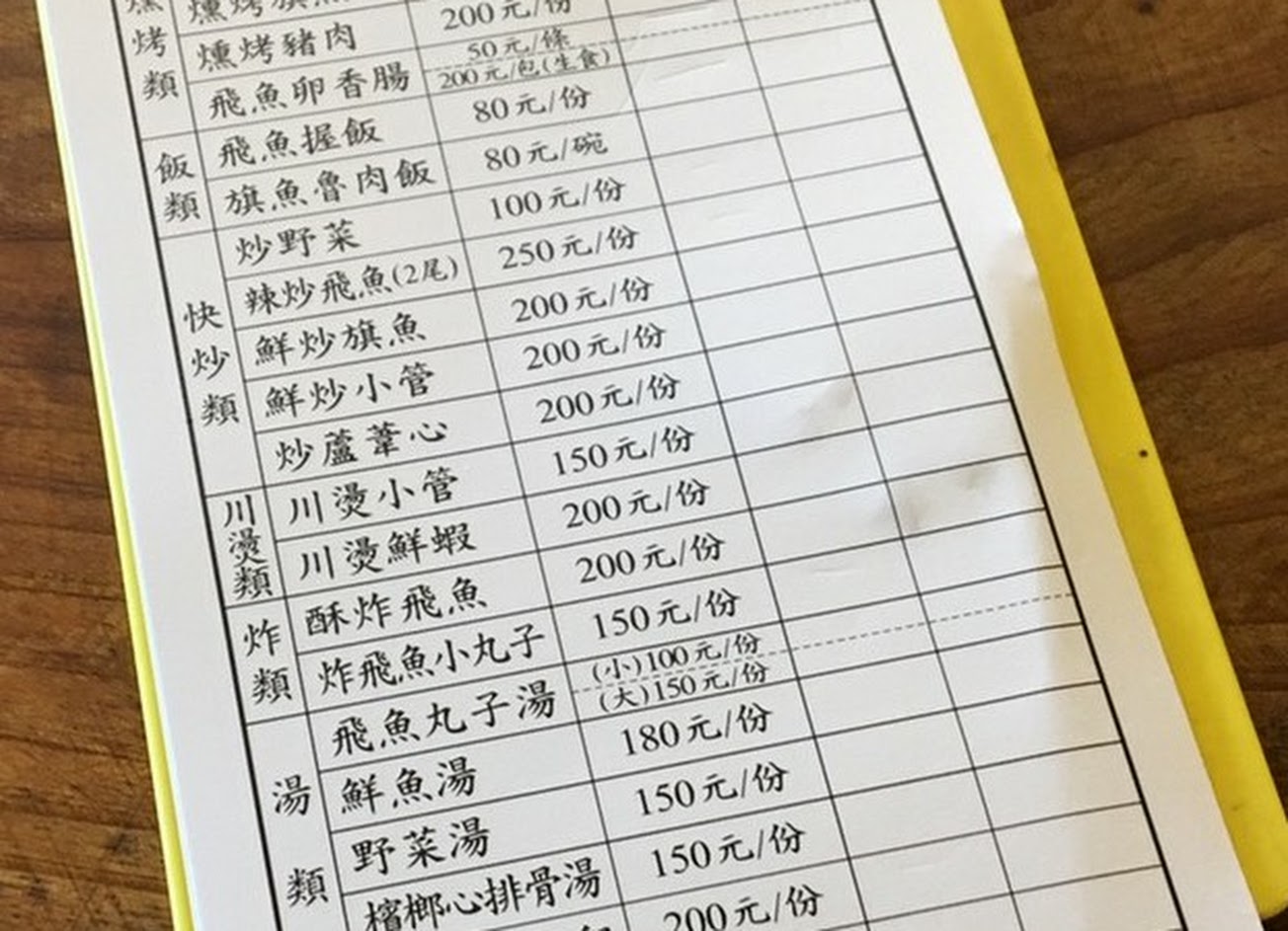辣炒飛魚夠味好吃, 炒野菜鹹度適中, 鮮魚湯太過簡單, 可惜定價過高, 且上菜時間過久, 鮮魚湯等了快一個小時, 我相信魚還在海上飄 🙂