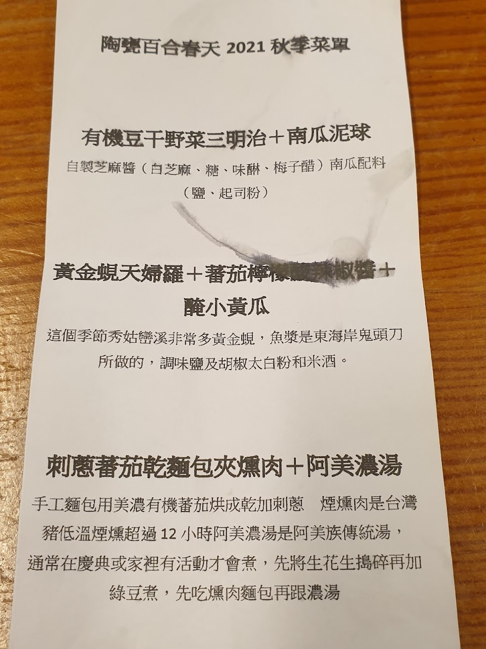 2021秋季菜單 詳細內容、名稱如圖示⬇️ 環境乾淨 餐具、裝潢佈置也有一定的特色 !餐點好吃 創意特色兼具 也吃的飽!細膩度或許有待加強 但整體表現覺得對的起價格 。如果剛好路過附近,雖不到錯過可惜,但也是絕對值得一試的餐廳?! …