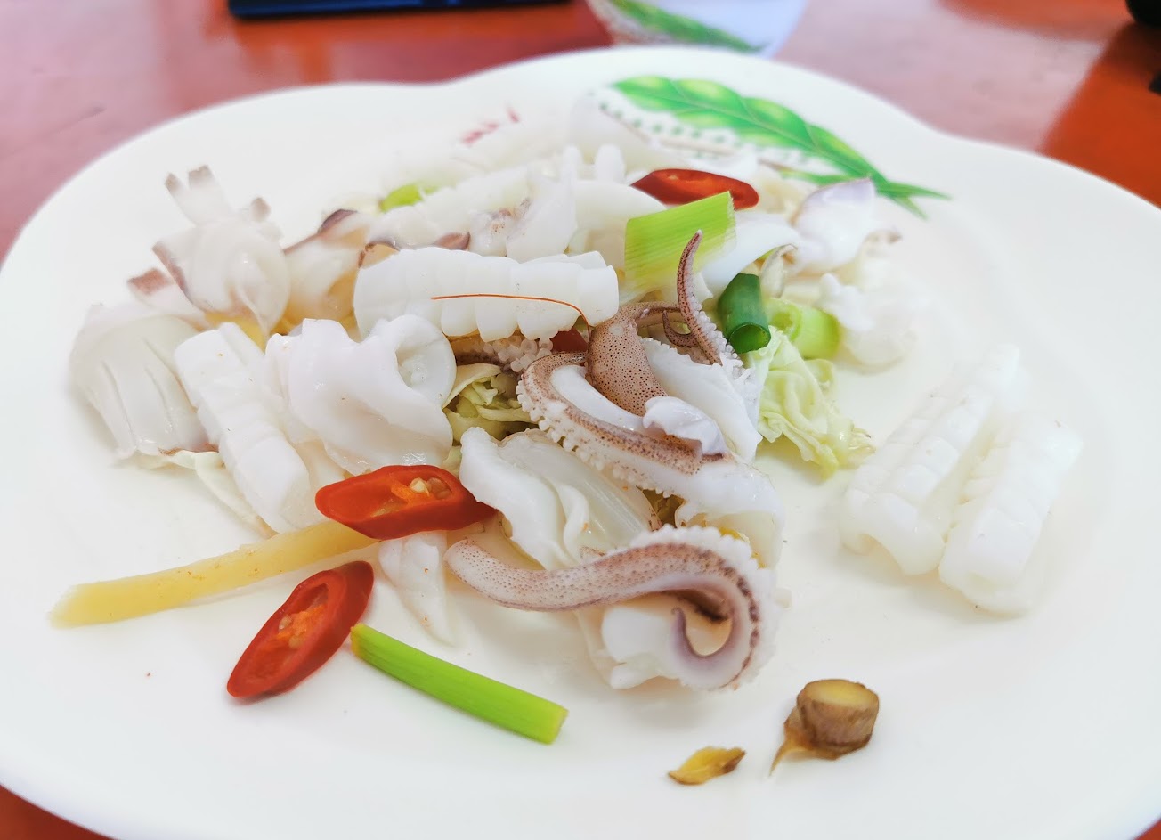 燙蝦一盤$200,燙花枝一盤$200,很新鮮!男老闆酷酷的,生魚片一盤$100,算是經濟實惠,海菜湯有加一點麻油,海菜味道濃郁好喝,小朋友愛喝