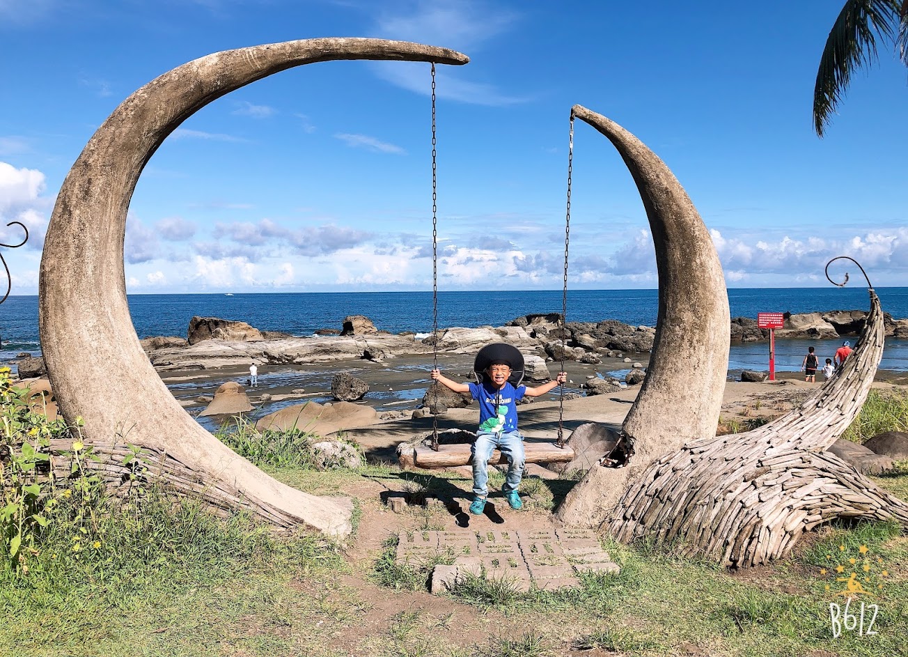 午後,按圖索驥來朝聖,大約在台11線64.5K處左右。大草坪、象牙型的夢幻鞦韆、椰子樹、一望無際太平洋,頗有南洋風,這畫面心曠神怡,美極了~此處海域是為「項鍊海灣」。