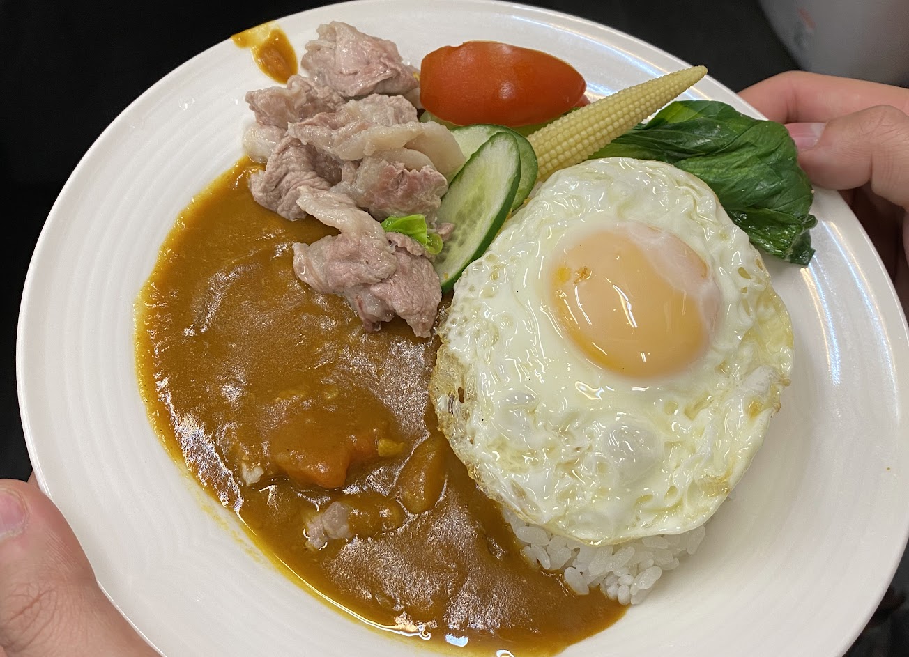 第一次看到連蛋白都沒熟的 咖喱飯是配生菜