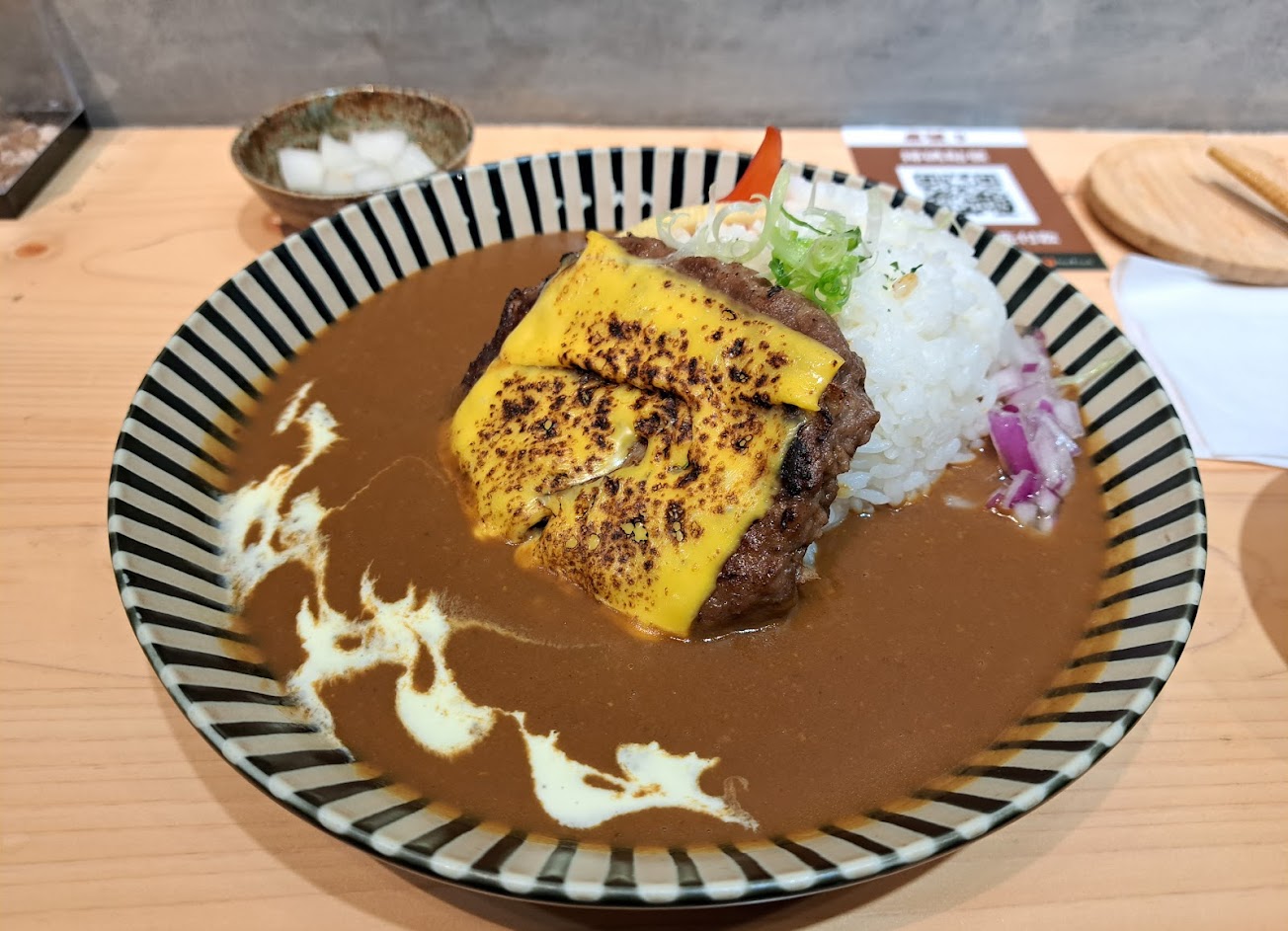 店面乾淨明亮舒適,老闆相當熱情客氣。而重點食物部份,起司漢堡排煎得恰到好處,微焦讓內外層有不同口感,咖哩本身香料味十足,搭配紫洋蔥讓口味有更多變化,非常值得一試