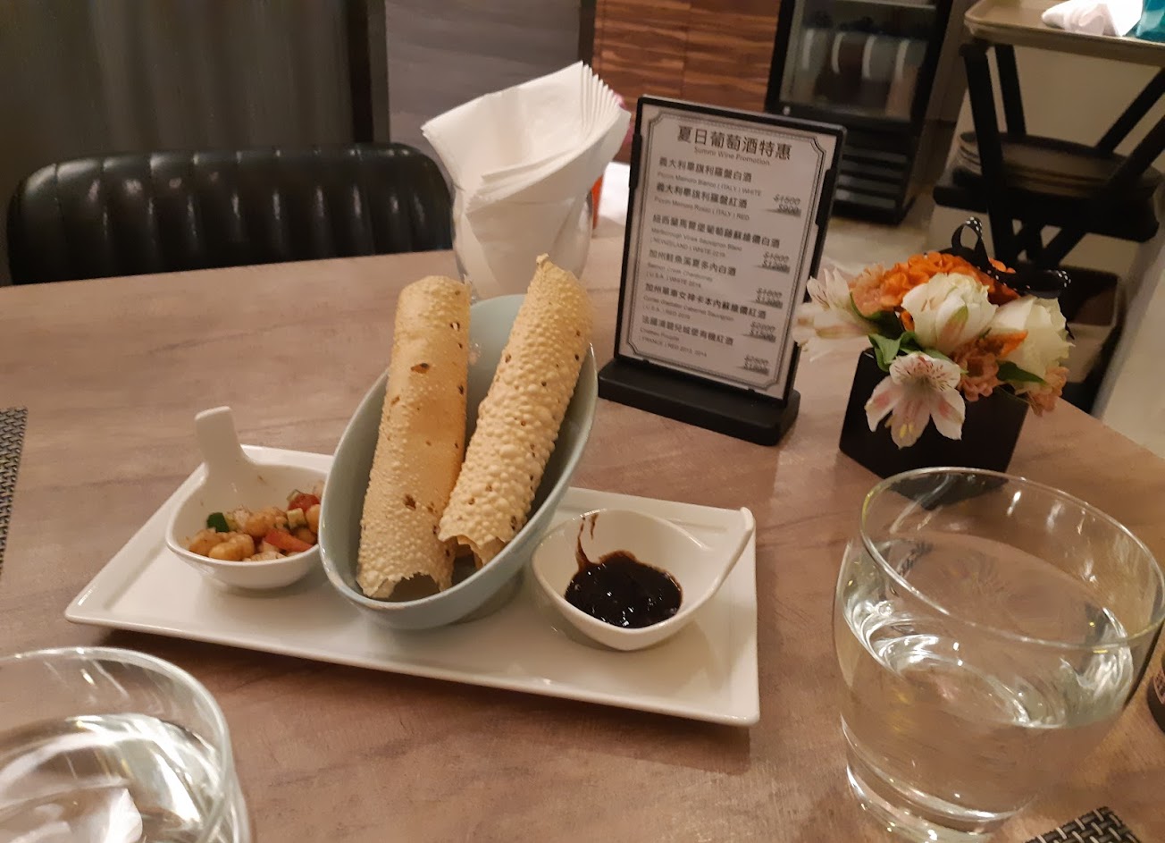 當天晚上點了套餐,附的前菜是比較鹹很薄很脆的餅 配優格醬或羅漢果醬,餅的味道我難以形容,但不是很喜歡。