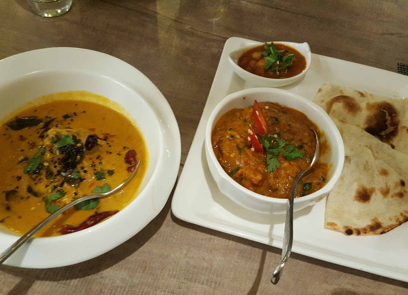 點了套餐的羊膝咖哩和紅香料雞肉咖哩,搭配原味烤餅和千層烤餅。羊膝咖哩令人驚艷,羊膝煮得軟爛且非常入味,紅香料雞肉咖哩則是大蒜味比較重,但兩者搭配烤餅都好吃,若多人用餐可點不同口味的烤餅試試。當日的湯加入甜菜根調味,雖然是濃湯但喝起來卻相當清爽。最後的香料奶茶也是一絕,各式香料意外的與奶茶相當搭,加點糖會更好喝