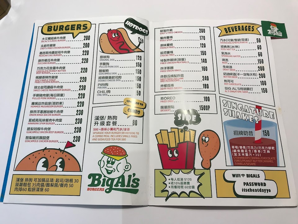 他們家漢堡超強AL經典牛肉堡多汁、節瓜也超強,來這這兩樣麻煩必點。 服務 內用 餐點類型 晚餐 平均每人消費金額 $400-600 建議的餐點 大艾爾經典牛肉堡 櫛瓜條 餐肉薯條 好吃的經典熱狗 主廚炸雞堡 秘製炸雞漢堡 奶昔們