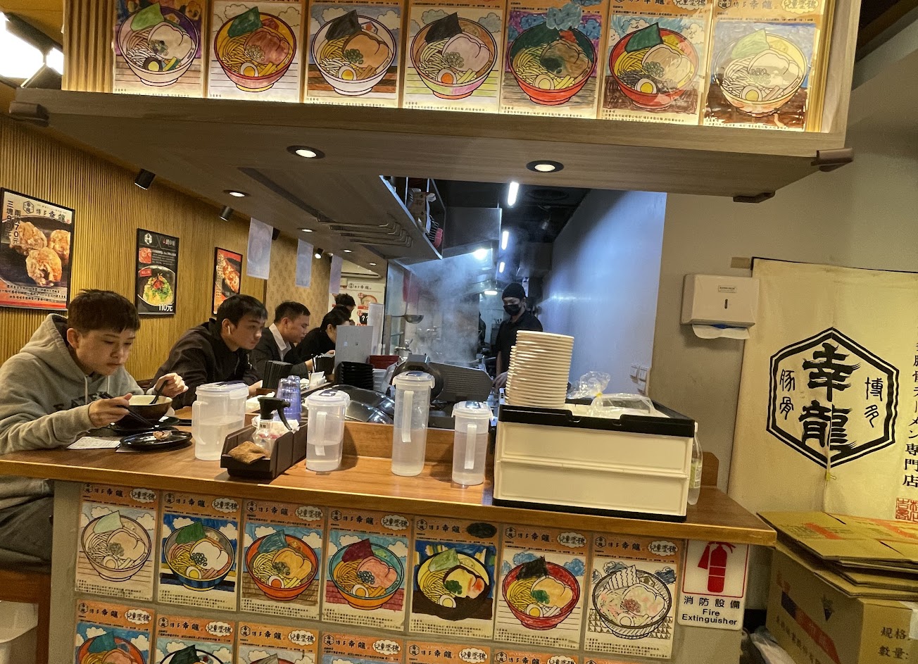博多幸龍拉麵,位在八德路巷弄之間的店,台北松山區的捷運小巨蛋站附近,在這裡也能吃到跟日本一樣道地日本九州拉麵,老闆是日本人,老闆說會選在東區的巷弄內開店就是因為這裡東區酒吧林立的聚集地,日本人最喜歡在喝完酒吧後再吃碗拉麵。