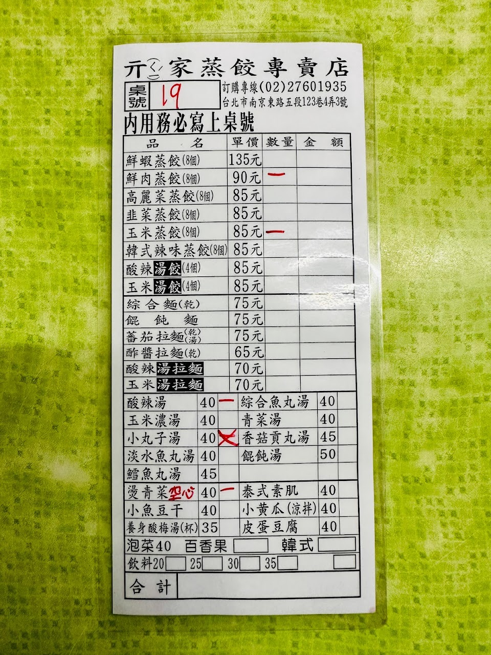 點了蝦仁蒸餃(NT.135元)、高麗菜蒸餃(NT.85元)、韓式辣味蒸餃(NT.85元)、玉米濃湯(NT.40元)、皮蛋豆腐(NT.40元)。