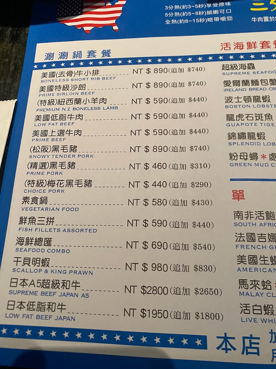 吃了精選豬肉和梅花豬肉,飲料和火鍋料=> 750元 湯:頗淡,不愛,可能就是涮涮鍋吧,接近水的感覺 肉:可能主推牛肉,所以吃豬很不適合,但我還是覺得,一盤兩百的豬肉弄到咬不動有點扯 CP值偏低,可能貴在地點租金吧,場地偏暗,旁邊堆著一堆待洗餐具感覺不是很好