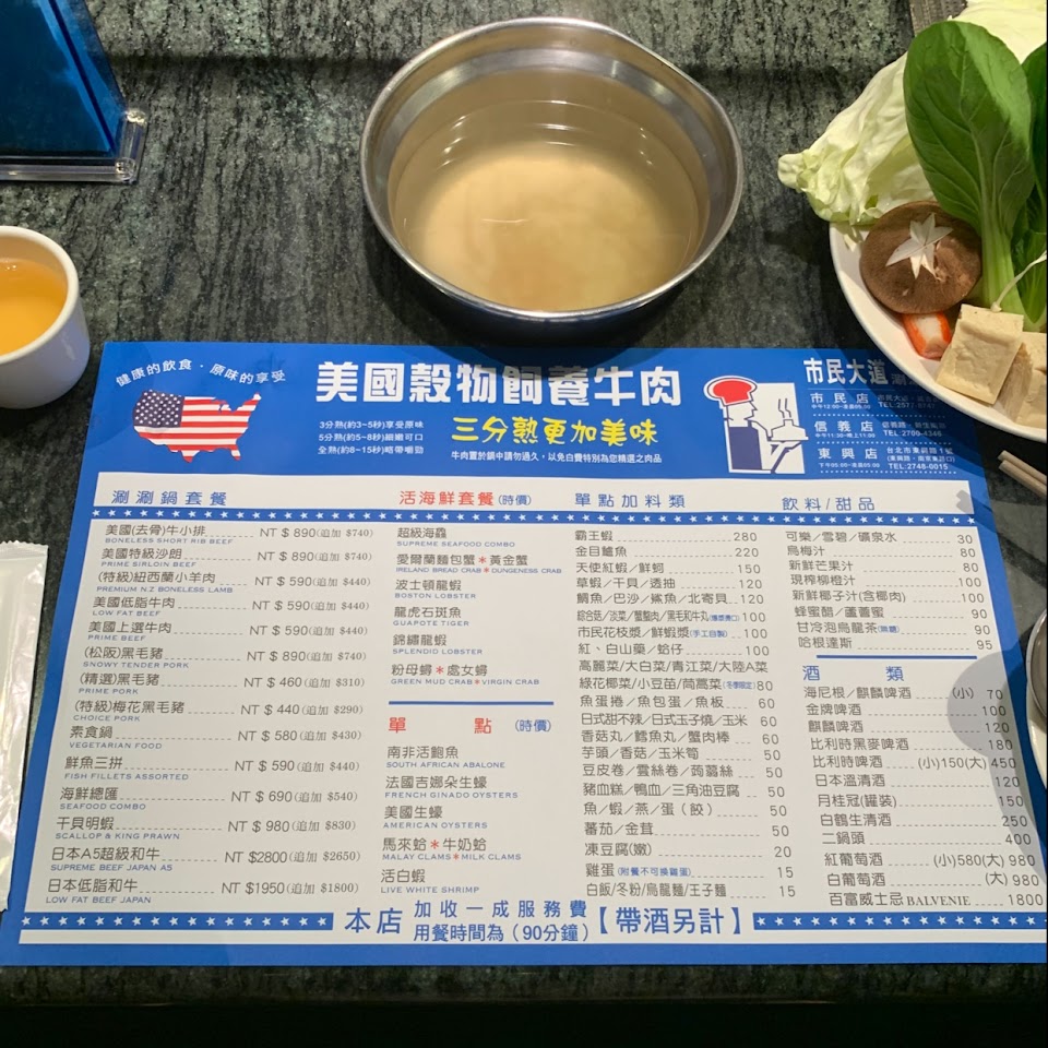 2019.04.18 @市民大道涮涮鍋 – 營業時間12:00-05:00 – 也是一間不吃會很想念的店 – 新鮮的海鮮?新鮮的肉質 – 醬料也好好吃(是沒有沙茶醬的) – 主菜 1.雪花豬肉 2.梅花豬肉 3.美國低脂牛肉 4.美國上選牛肉 – 單點 1.鯛魚片 2.鮮蚵 3.蛤蜊 –