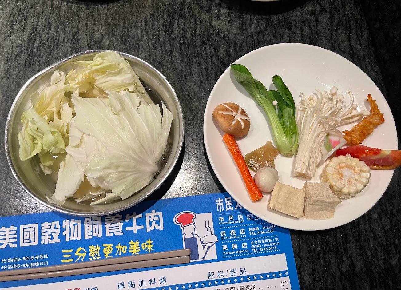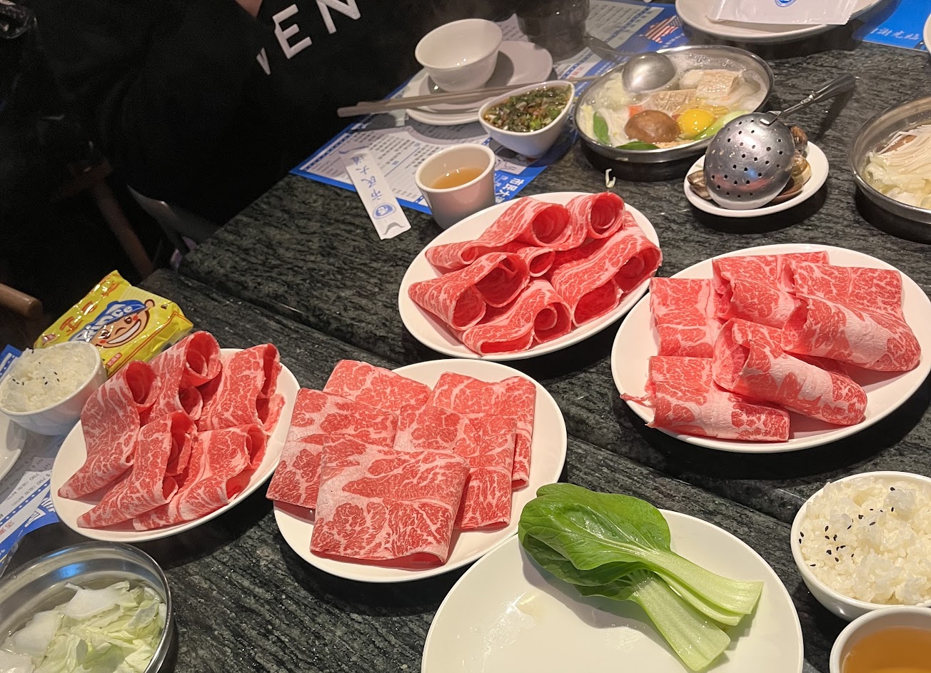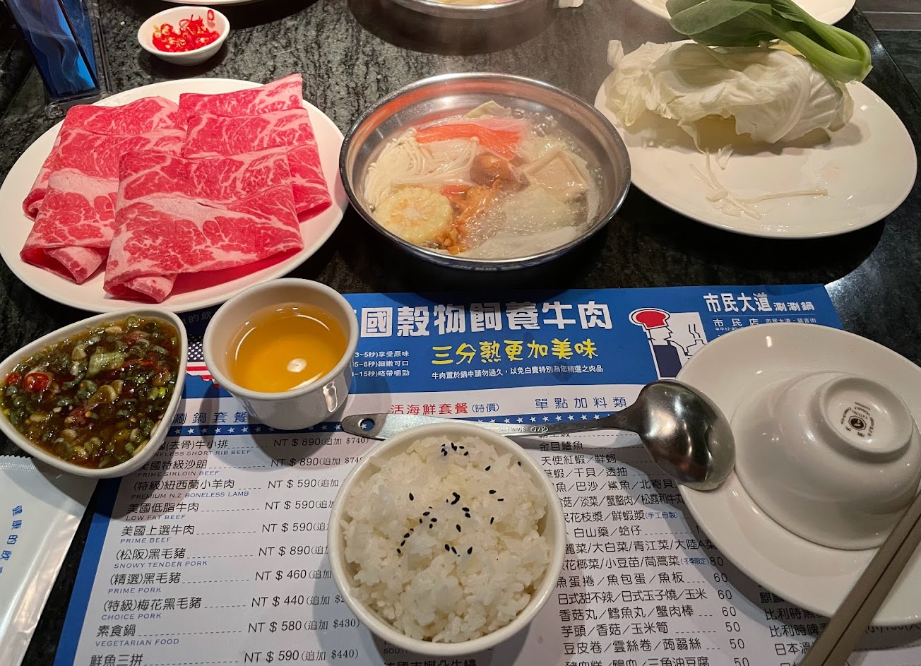 湯完全沒味道 菜煮完跟在家用水煮一樣味道 肉也很普通 每個料都要沾醬才有味道 但又沒有醬料台 醬沒了還要請店員幫忙裝 整個套餐超不划算 最好吃的是最後甜點上的冰綠豆湯