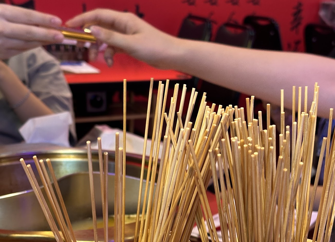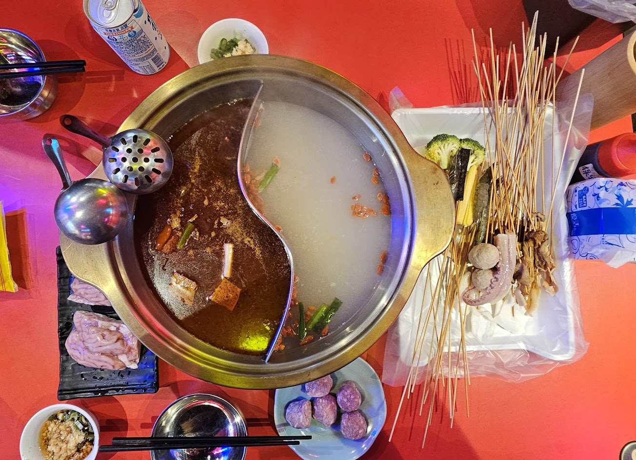 這家串串鍋是朋友看谷歌高評分選的,我們去的時候覺得還可以,但點餐的時候卻覺得點不到什麼,去拿串的時候,看到好長好長的竹籤最尾端,插著一塊很小很小的肉,覺得有點無言,是要花多少時間切跟串這些玩意兒啊… 然後雞肉吃起來粉粉的,牛肉包的東西放進湯裡很多串都散了?,覺得吃了個空虛。