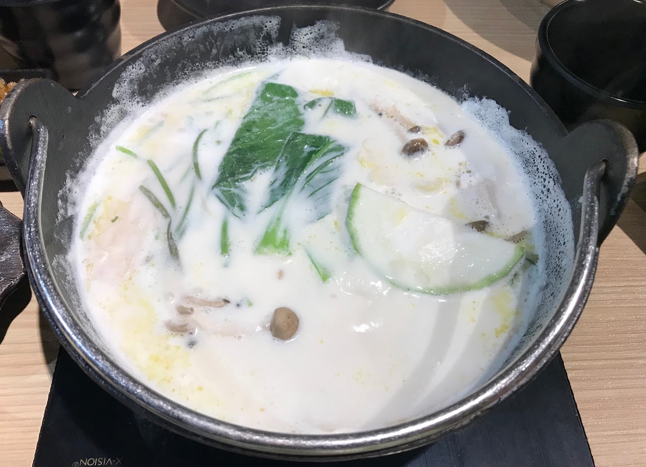 牛奶湯底好喝濃醇香,菜盤配菜比較少…其他都算不錯。湯匙等不習慣…感覺會打到鼻子