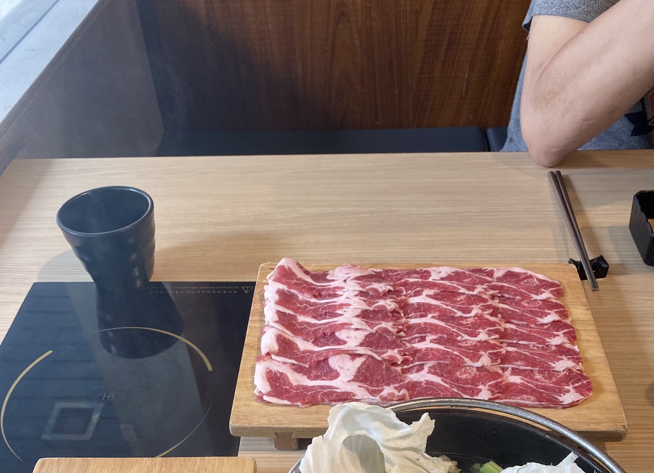 用餐時間限制是90分,店家不會主動提出如何讓你放置包包,服務上就稍顯不佳。 在肉品上,豬頸肉滿嫩的不錯吃,而低脂嫩牛就稍顯普通。麻辣湯(要加價90元),對我來說不算辣,煮起來會是濃稠的湯底感,口感普通。醬料部份在醬油那端有加金桔,口感清爽可配肉吃。 外場人員分工不佳,有人很忙碌,有些人則輕鬆到在裡面那嘻笑玩耍,感觀不好,整體服務上你只會感覺到他們收盤子的速度很快。結帳人員在結帳時的服務態度讓人感覺不錯。 整體上CP值算中等,可以來嚐鮮看看。