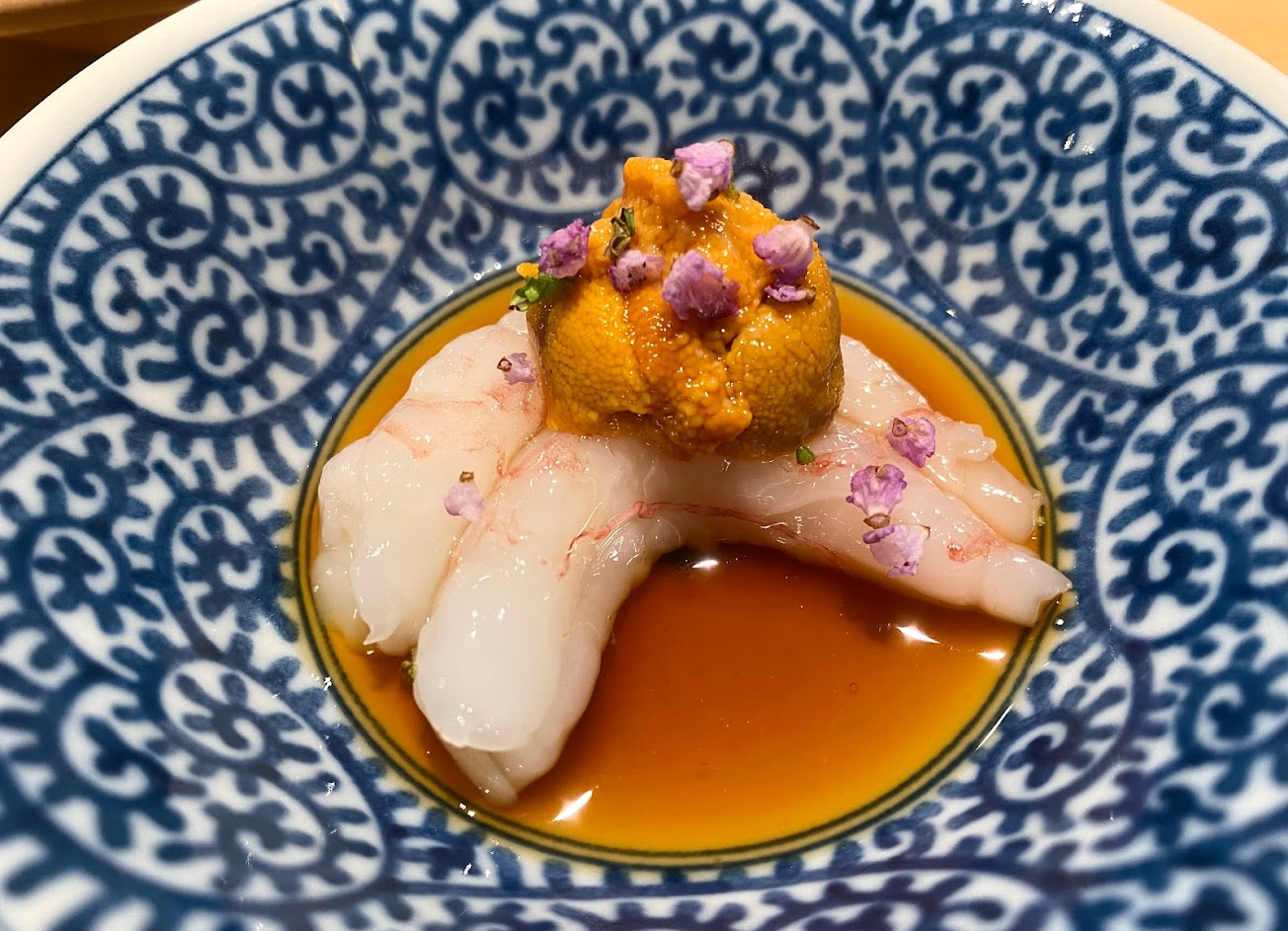 系統限制,只好給五星。防疫期間,海膽甜而不腥,鮪魚油而不膩,炸甜蝦酥而不乾,絕啊。