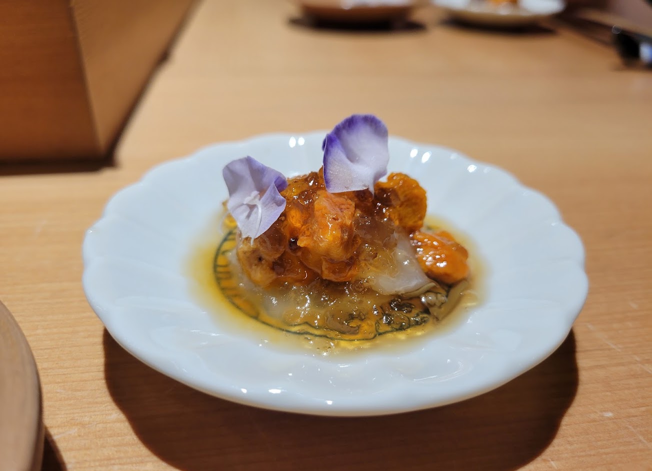 -內場處理好後拿到板前再一一出餐,我是最後一個拿到的,可習餘熱繼續讓干貝內部熟化,跟我預期中外熟內生的口感有出入(微失望),但干貝依然非常鮮甜~