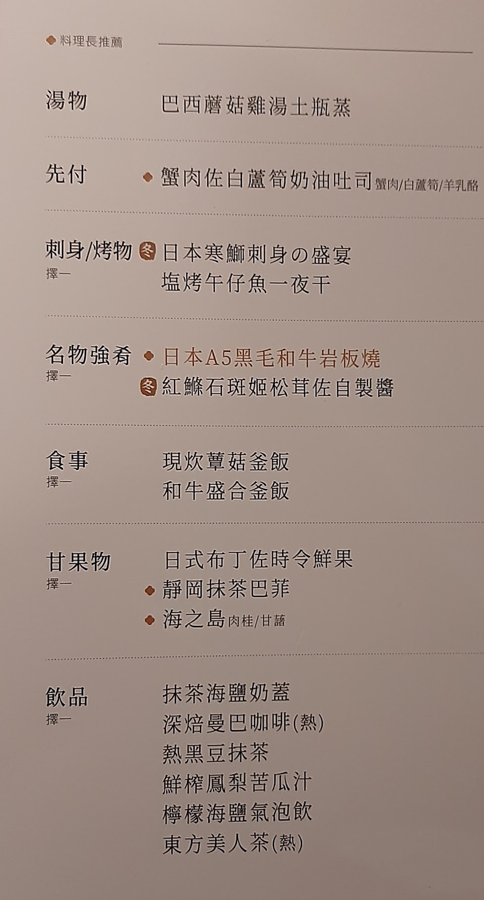 土瓶蒸 魚皮野蔬沙拉 霜降牛 現炊蕈菇釜飯 岩燒櫻桃合鴨