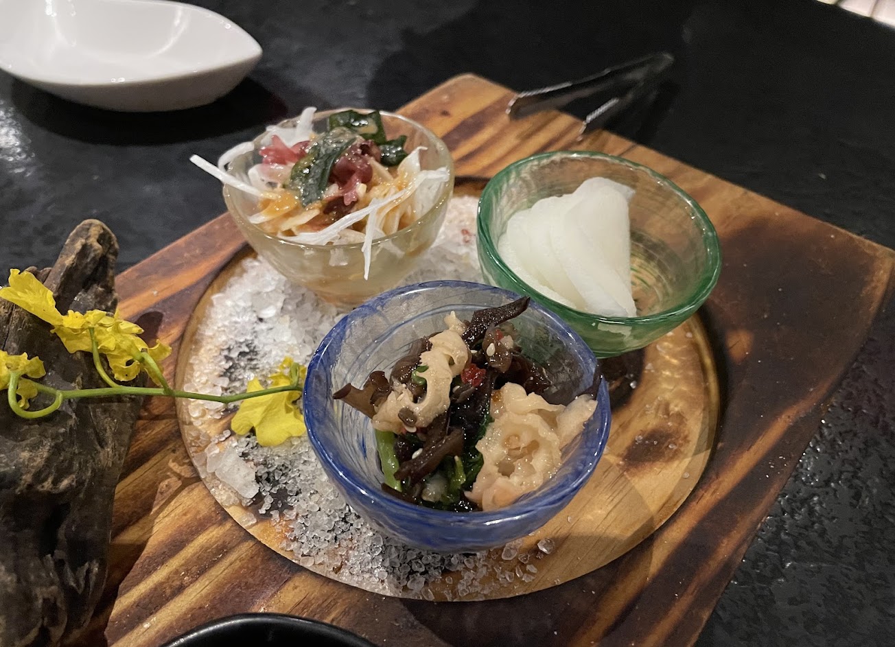 初次到ikki吃飯,王品系列的風格就是每樣餐點都可以有很多選擇,所以我們各自點了980元的集上套餐。我點了湯、魚皮野蔬沙拉、寒鰤刺身、極黑和牛(自己岩板);朋友點了湯、燻鮭魚番茄優格、烤午仔魚、寒鰤下巴;另一人跟我一樣,但點了和牛岩板燒。