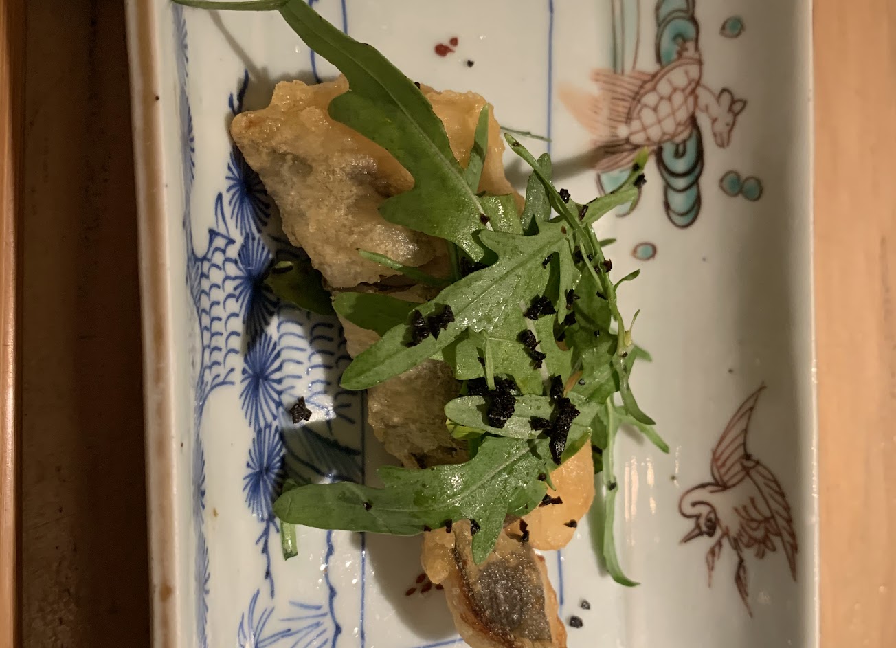 2. 前菜:白鯧天婦羅、芝麻葉,海帶