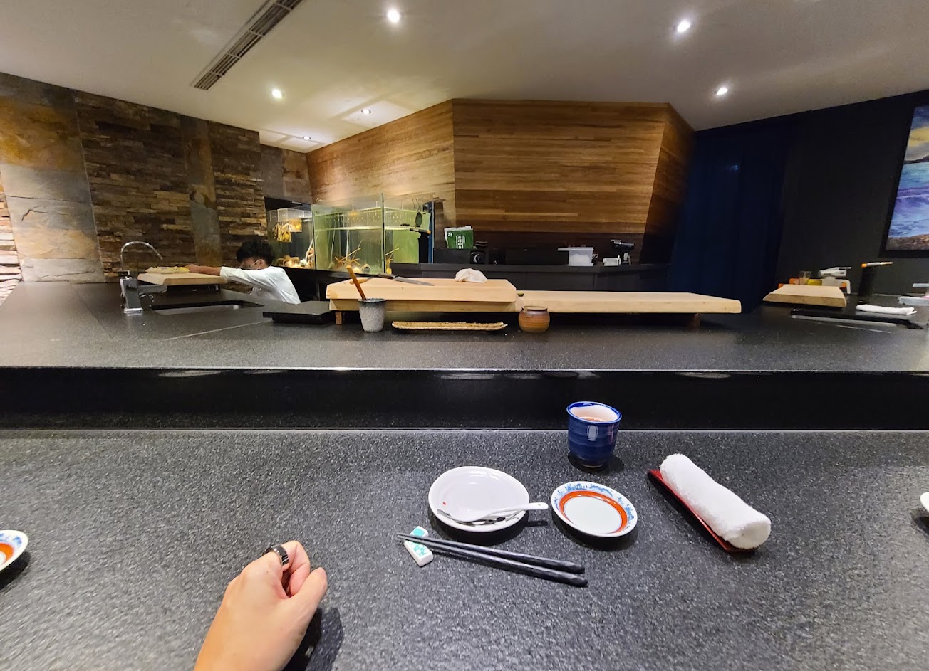 店內是使用黑色系。一進去先給茶水熱毛巾擦手再點餐,因為是無菜單料理,只需要選擇價位就好,差異只有食材,份量是一樣多的。 ,我們選擇的是2500的價位。點完餐師父就開始準備了,這裡的師父不像傳統日本料理師父的穿著,反倒是穿白襯衫。從前菜蟹肉豆腐,白肉生魚片開始慢慢上,師父在吧台裡面做好後放到面前的盤子,我們再夾回自己的盤子吃。後面慢慢進展到紅肉握壽司,炸魚,熱菜,最後還有湯跟水果甜點。每盤都一點點,但吃到後來很飽耶!干貝跟海膽都好新鮮好香,非常滿足。甜點是白芝麻冰淇淋,比一般的冰淇淋更天然的感覺,做一個完美的ending 餐點:5 服務:5 氣氛:5