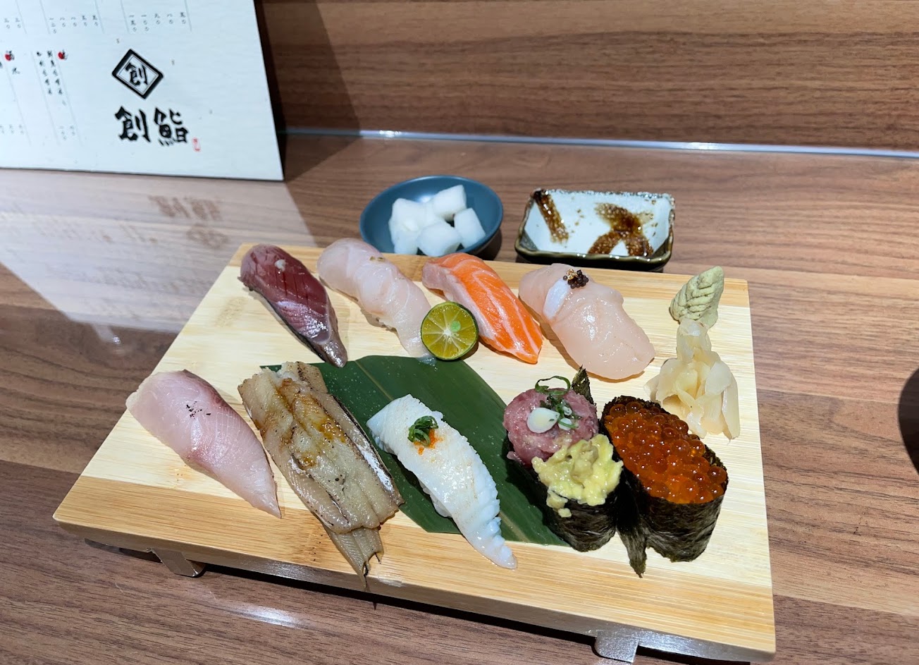 「創鮨」店裡裝潢乾淨舒適,用餐氣氛舒適、熱情。二位師傅很用心的料理,食材新鮮、用料實在。