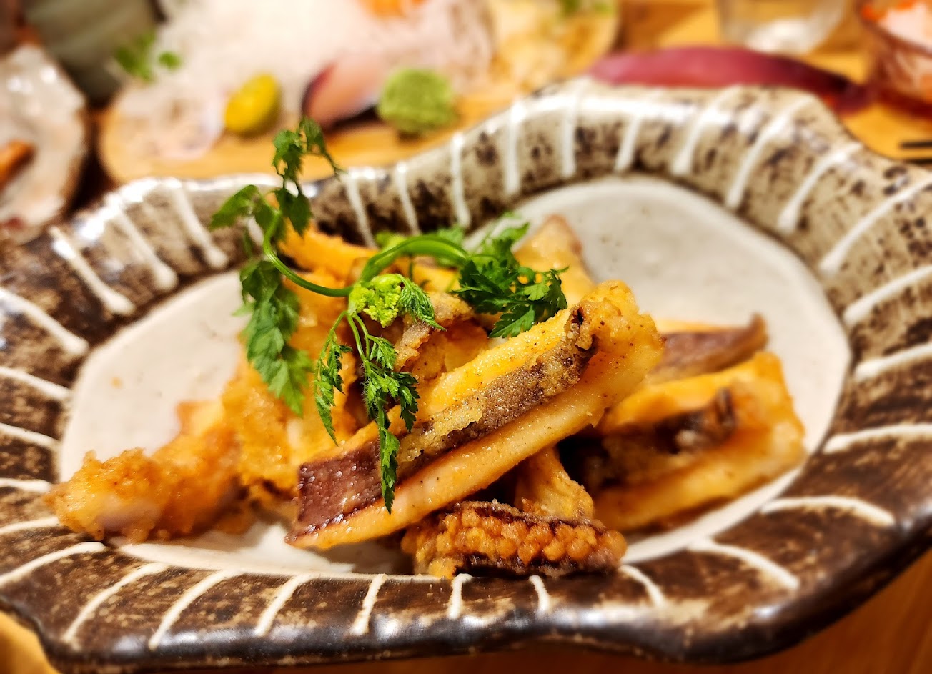 欣然同意,店家客氣招待了炸魷魚一份