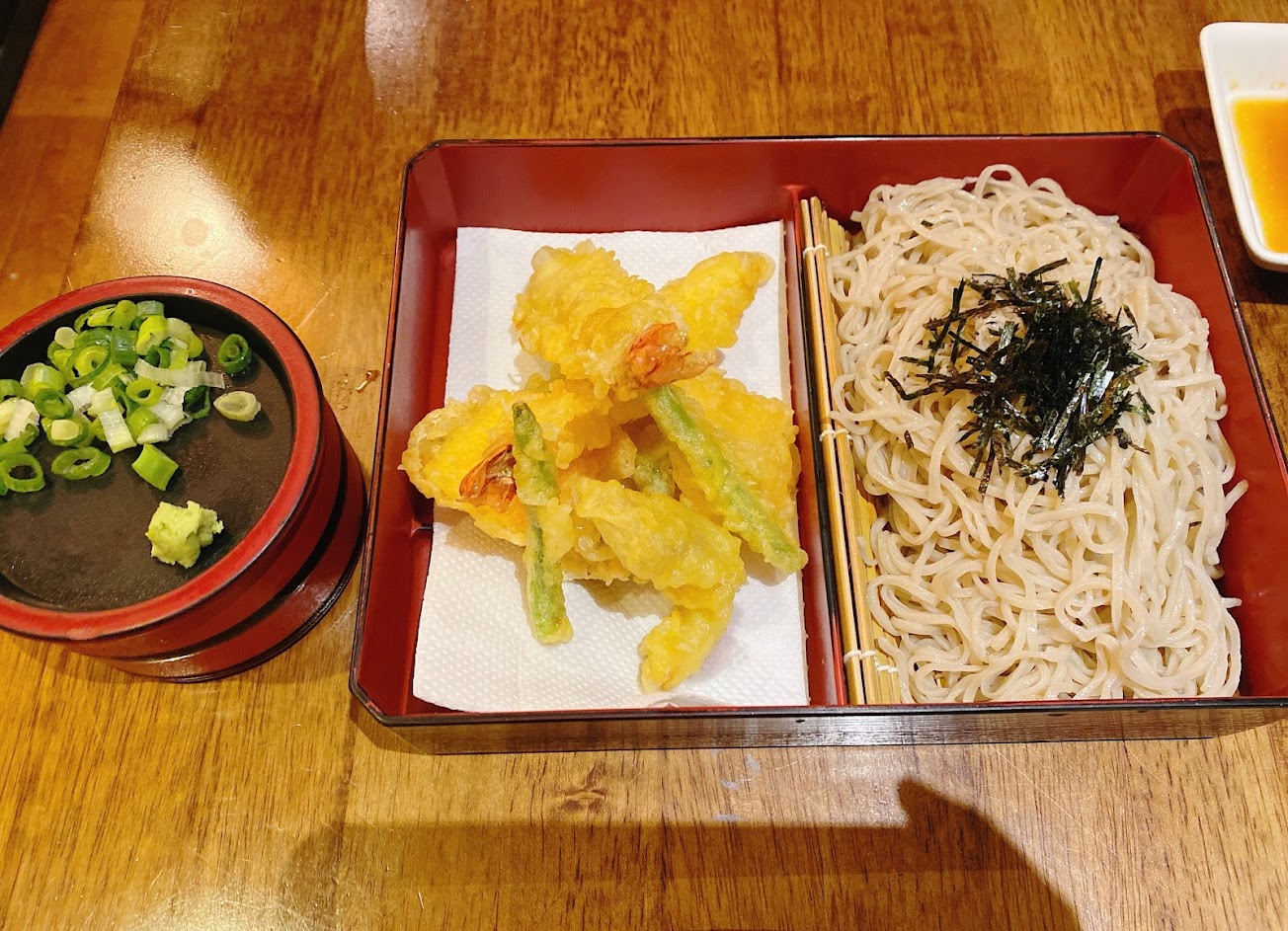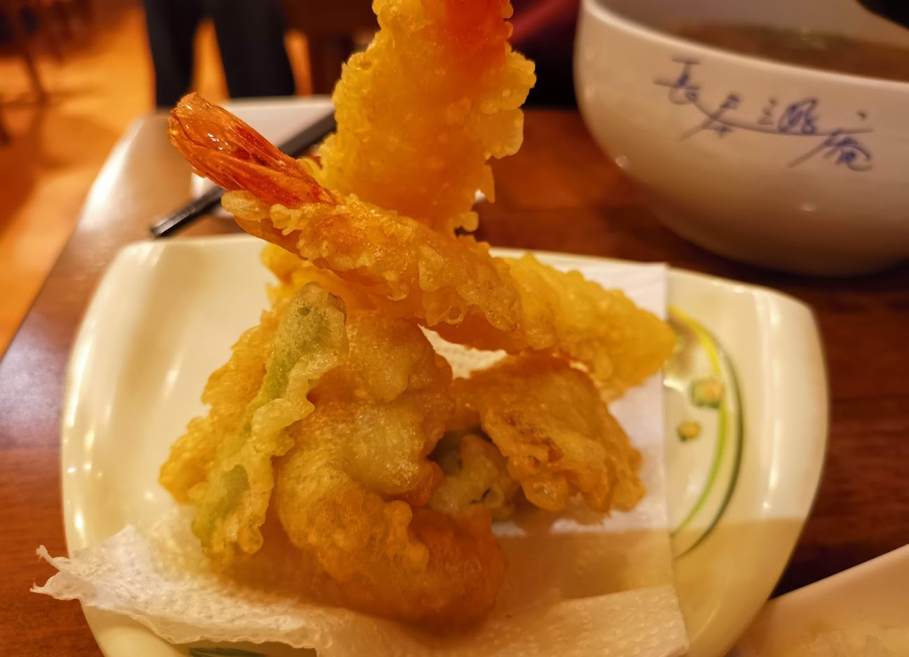 店面老舊了,上個廁所挺擔心的。兩人今天點了炸櫻花蝦天婦羅蕎麥沾麵及炸蝦天婦羅蕎麥沾麵,天婦羅好吃,但蕎麥麵沒有什麼蕎麥香味,沾醬也很普通。