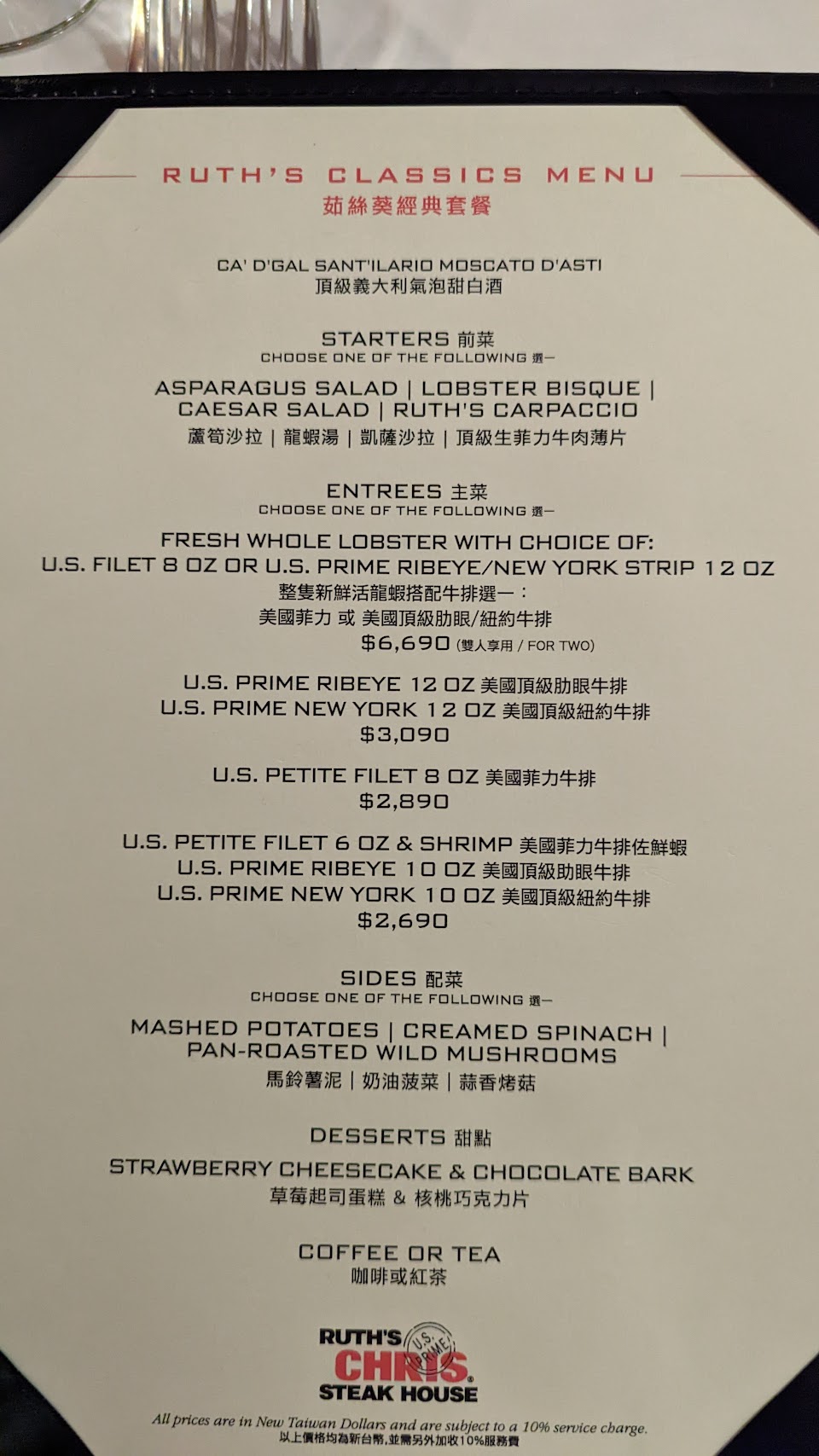 一如往常,餐前的麵包加奶油/前菜的蟹肉球與佐鮮蝦/菲力跟肋眼/餐後的香蕉派、布蕾…全是驚艷!
