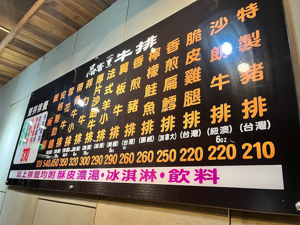 牛排、雞排大塊,豬排稍小,麵量很多,菜量很少,還有一個蛋。缺蛋所以麵不能換蛋。加點的干貝小小的就ㄧ口一個。附酥皮濃湯,還可以。飲料無限暢飲,冰淇淋剩底部一些。環境被油煙燻的油膩感。平價的普通口味牛排,吃飽可以。價錢漲30元,漲幅超過10%,服務待加強。 服務 內用 餐點類型 午餐