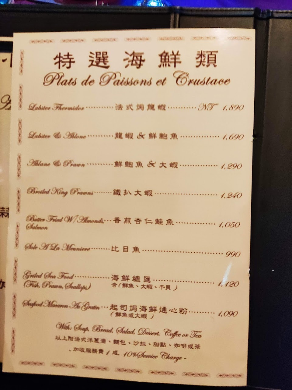 菜單基本都大同小異,有現代西餐廳鮮少見到的鵝肝醬牛排,還有名字很特別角尖牛排(看以前的菜單英文是菲力,但現在是勒眼)菜單是寫10oz,但實際看起來跟吃起來應該都有超過,是一塊非常厚實的肉,可惜熟度不均,油脂的部分也沒有煎出香氣。鵝肝醬牛排的牛排表現就不錯,也許是形狀的關係熟度表現好太多了,本身也是嫩的肉,點這道之前會特別提醒鵝肝味道比較重,如果是不能接受內臟類的人就不要勉強了,個人是滿愛的。