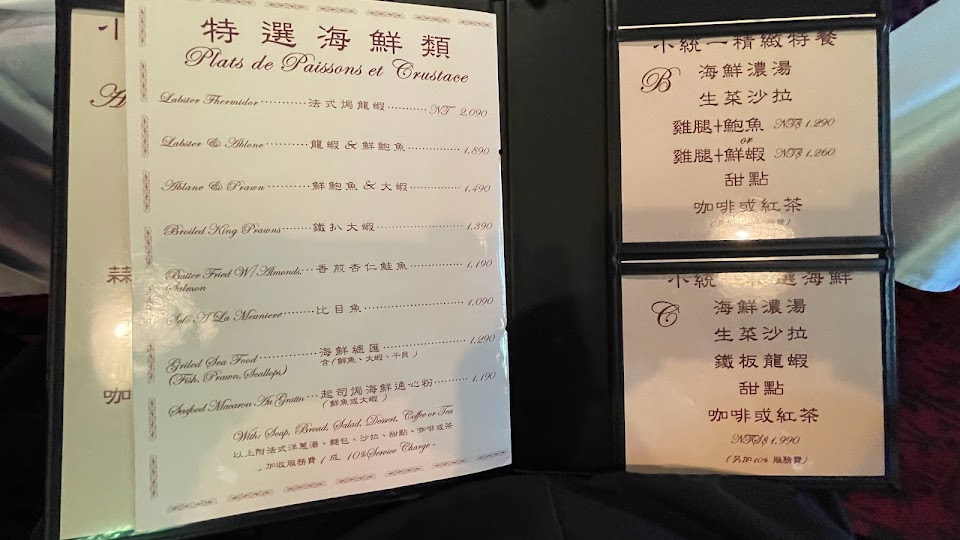 點最貴的套餐2990元,龍蝦只有半隻,牛排小塊到傻眼,一個小拳頭大小,這麼怕人吃,省成本嗎?前菜蔬菜棒、沙拉蔬菜盤、配菜熟蔬菜,這三樣的東西都是一樣的!!是要吃幾次?明明中午店裡也沒有客滿狀態,還要求人要11:30到場?想好好吃頓飯、服務生一直盯著你,三不五時來打擾,催促趕很明顯,吃不到一小時就走了,心情很差不會再來了!!