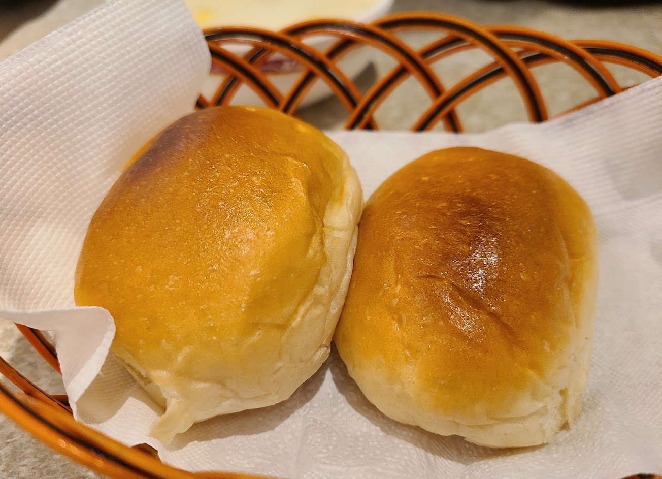 附餐有奶油小餐包跟玉米濃湯,也都很好吃