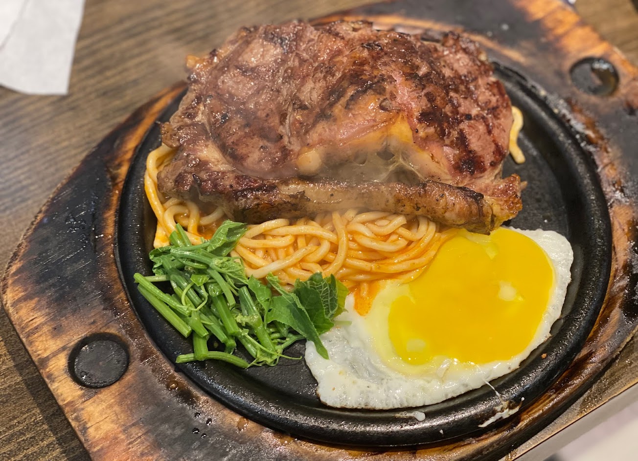 美國翼板很有咬勁,肋眼上蓋肉很軟嫩,熟成肉排事先醃漬,先煎再考啊,外皮焦香,內部軟嫩juicy ,有空調座位,隱身饒河夜市內,麵條口感很好,份量足,男生吃的飽,算是CP值蠻高的一家牛排餐廳