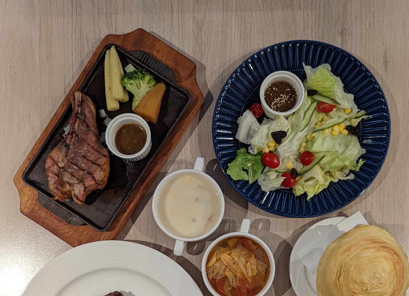 肋眼牛排七分熟很嫩很好吃,沙拉跟酥皮濃湯都不錯,翼板牛排筋很多不好咬比較不推薦