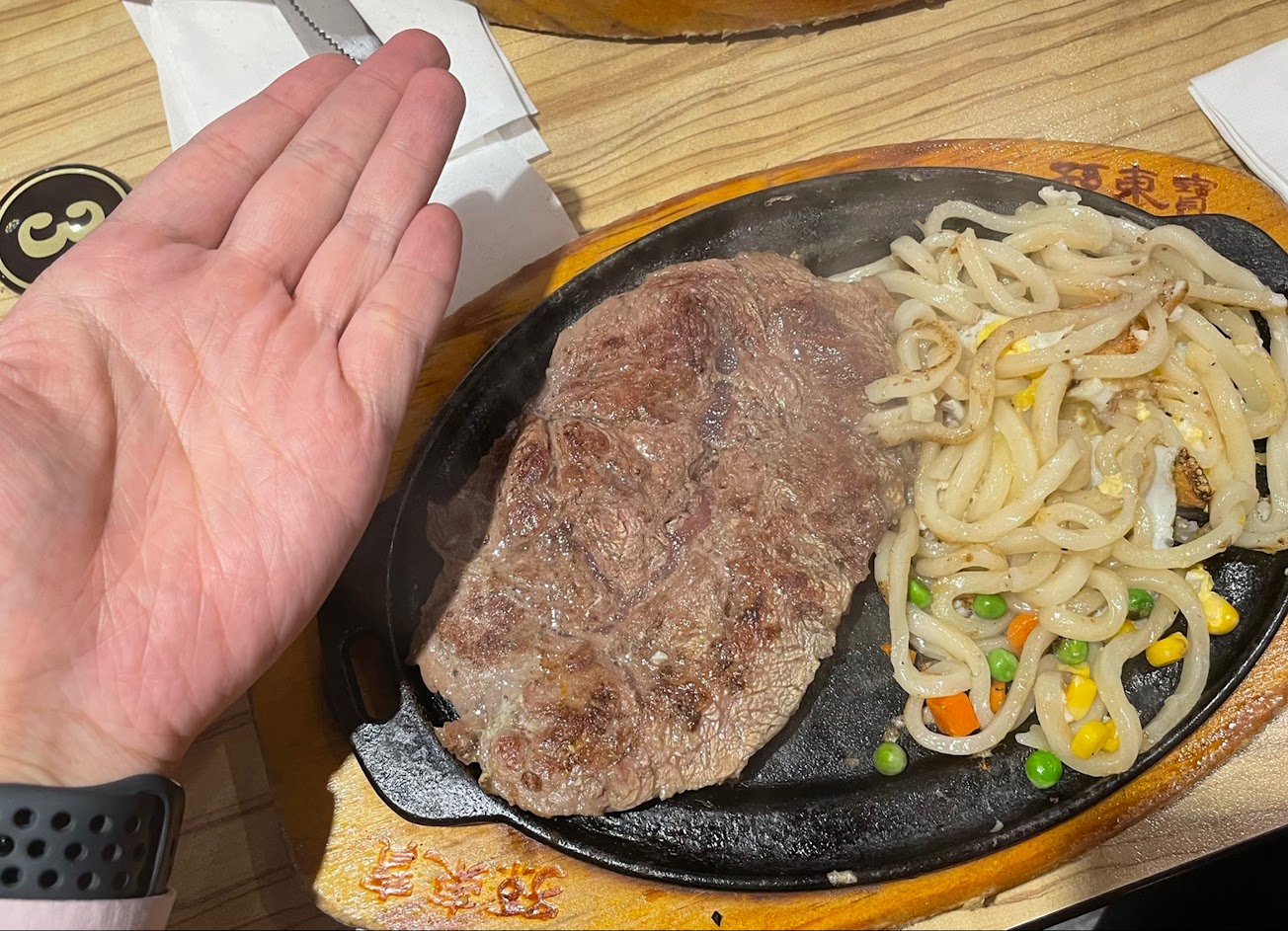 牛排味道普通偏硬,鐵板麵其實用夜市版的比較好吃