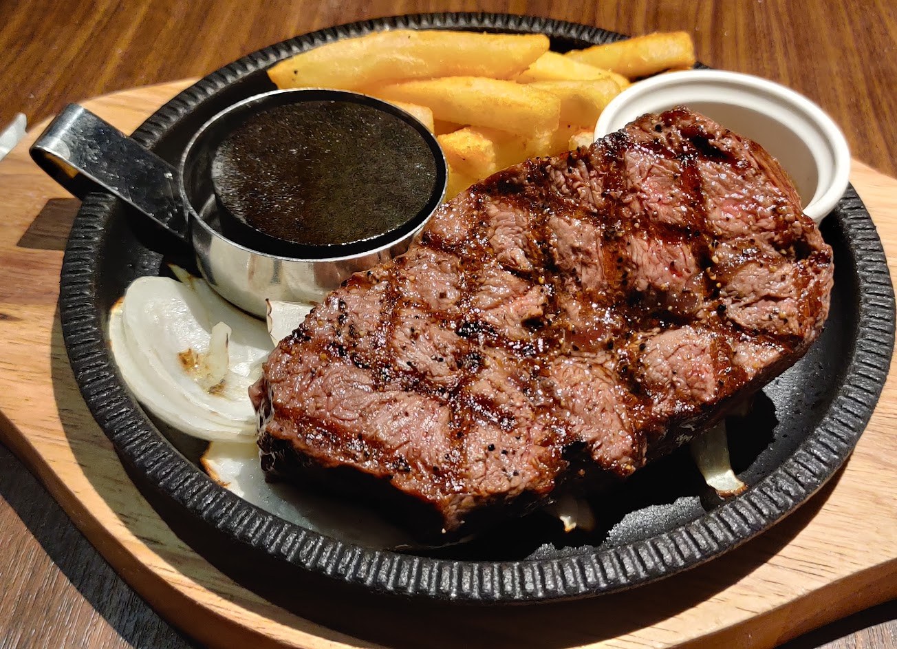 排餐加自助吧 可以吃得超級滿足 牛排會附上熱鐵塊 可以自己控制肉的熟度 但也因此產生很多油煙味 即使不點牛排 只要鄰桌客人有點 就會充滿大量油煙味 自助吧的甜點 生菜 麵包 湯和咖哩都非常好吃 部份選項在其連鎖集團也都能吃到的味道 如果不想吃肉的話 可以單點自助吧即可 或是同行者點一份主餐即可