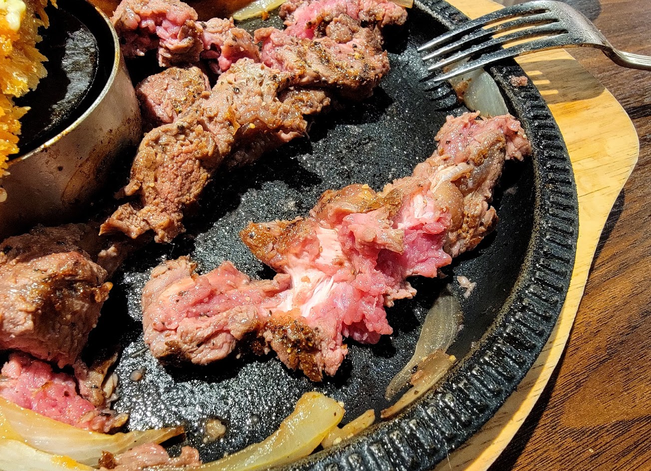冷藏熟成嫩肩牛排還不錯,但是亂切洋蔥牛排明明就是肉片怎麼說是牛排?跟圖片差超多,而且還很硬。都有附小加熱鐵塊讓你加熱覺得生的肉,鐵塊冷掉了也能請服務生換。 沙拉吧沒啥東西,也沒冰淇淋,生菜醬淋了一個看起來像凱撒醬的醬,吃起來卻沒啥味道… 咖哩蠻辣的,蛋糕很難吃咖啡很難喝,蘑菇濃湯蠻好喝的這個大推。 觀察好幾次,來收餐盤都會選擇性只收一部分,不知道為什麼不一次收完。 用餐要加服務費,如果能選擇只單點不加沙拉吧會更加分,目前覺得性價比不高。