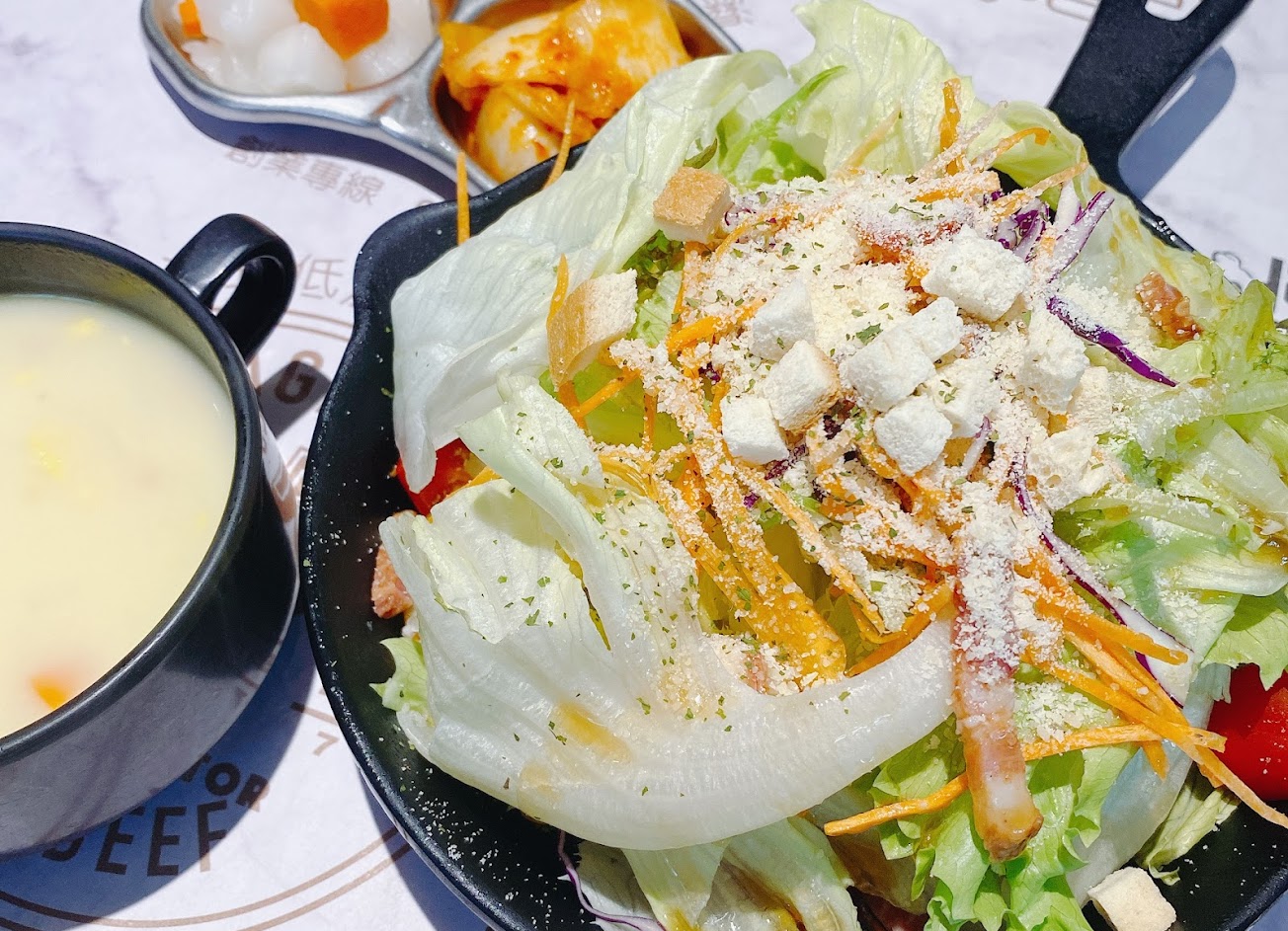 很棒的是除了肉之外,連湯、附贈的小菜都好吃,牛肉羅宋湯裡居然也有大塊實在的肉!完全沒有偷工減料~連玉米粒我都覺得超級好吃,有特別炒過,不像有些無良牛排店收500多塊的餐費還拿三色豆來擺盤…
